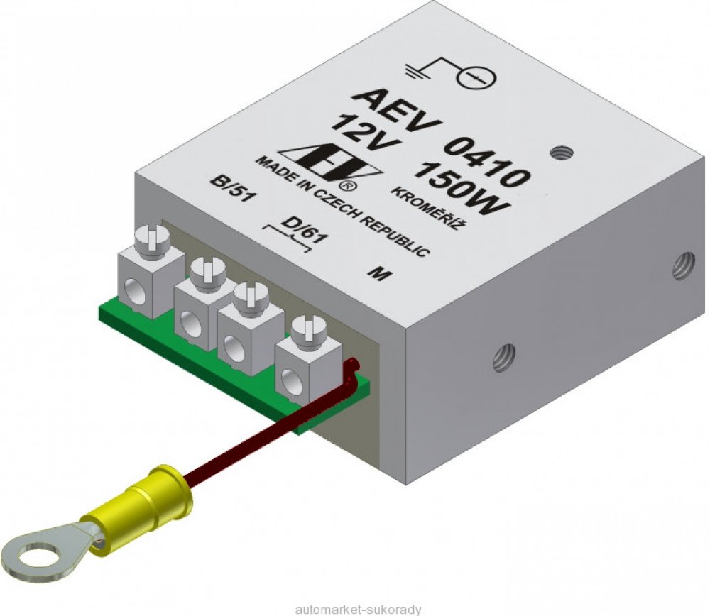 Regulátor AEV0410 je určený k regulaci derivačních dynam v zapojení s tzv. mínusovou regulací, kdy regulátor spíná budící vinutí dynama proti kostře a pro síť se jmenovitým napětím 12V, která je provozována s mínusovým pólem akumulátoru na kostře. Regulátor zajišťuj...