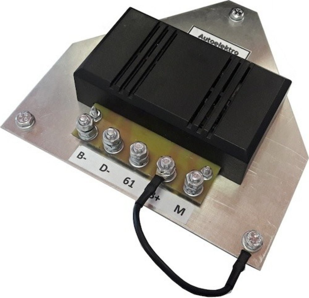 Regulátor napětí pro dynamo 24V Tatra 148.Tento regulátor napětí je konstruován a určen jako náhrada za původní regulační relé.Použití tohoto regulátoru nevyžaduje téměř žádné úpravy a zapojení v montáži, kromě vodičů připojených k regulátoru následně opatřenými a dodanými kabelovými očky.I nadále zásadně platí ukostření - pólu akumulátorů , zapojení dynama zůstává nezměněno - pozitivní regulace (viz schéma zapojení).Pro montáž regulátoru na místo původního regulačního relé je dodán i spojovací materiál včetně matice M5, která slouží jako distanční vymezení mezi regulátorem a konstrukcí karoserie.Mínus na kostru.Plus na buzení.
