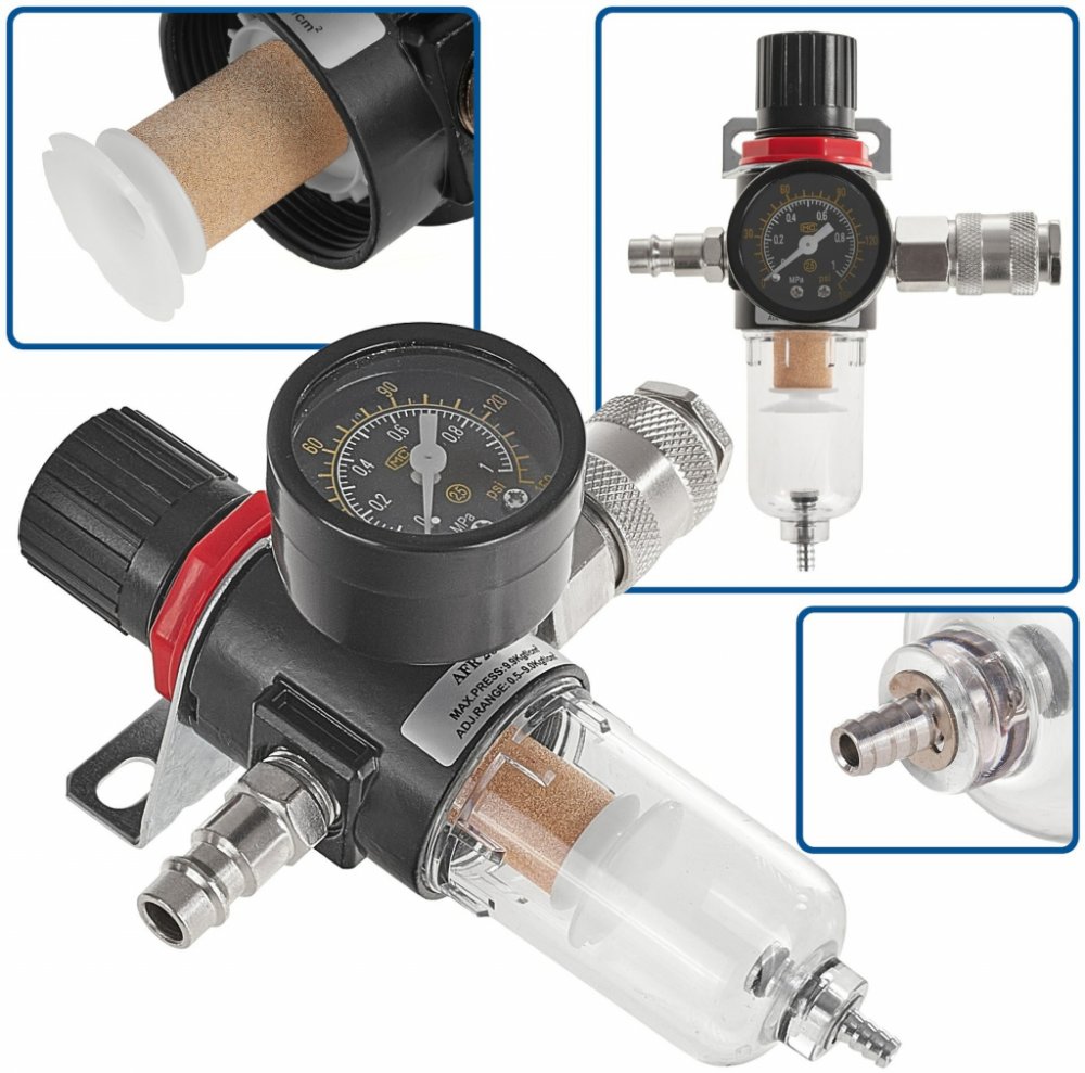Regulátor tlaku vzduchu s odlučovačem vody 1/4"Zařízení je navrženo tak, aby čistilo přiváděný vzduch od většiny kapalných a pevných částic. Je vybaveno regulátorem tlaku, který umožňuje plynulé nastavení výstupního vzduchu tlak v rozmezí 0 až 150 PSI.