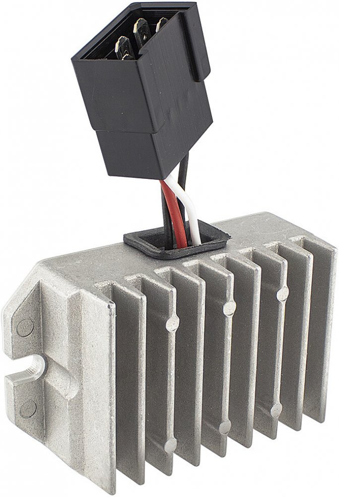 Regulátor 6V, 1-fázový regulátor s usměrňovačem, pro alternátory s permanentními magnety do výkonu 100W. Neobsahuje výstup pro kontrolku dobíjení. Je určen pro soupravy 1 i 2 válcové 6V.