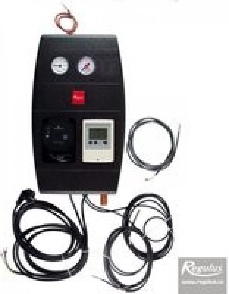 Jednotrubková čerpadlová skupina s integrovaným regulátorem SRS1 T pro 1 solární spotřebič a třemi čidly v ceně, s čerpadlem Grundfos UPM3 Hybrid 7m, se zásuvkou s výstupním napětím 230 V pro připojení topného tělesa o výkonu až 3 kW spínanou HDO a regulací, s ukazatelem průtoku. Napájecí kabel do zásuvky 230 V a kabel pro připojení na rozvod ovládaný HDO.