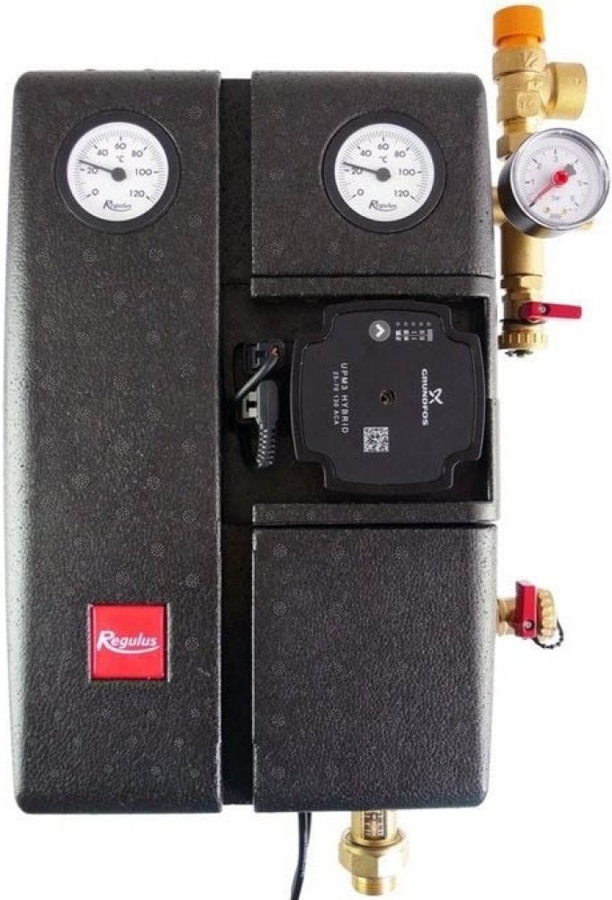 Dvoutrubková čerpadlová skupina s čerpadlem Grundfos UPM3 Hybrid 7m, s ukazatelem průtoku, pro regulátory s PWM řízením nebo spínáním 230 V (on/off). Napájecí kabel do zásuvky 230 V.