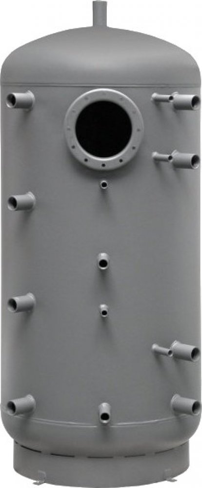 stacionární nádrž akumulační s jedním výměníkem, plocha výměníku 2,7 m2, nádrž je opatřena výměníkem pro připojení solárního systému a přírubovým hrdlem, ocelová, svařovaná nádrž, 9× návarek Rp 6/4", statická ztráta 136 W, průměr×výška 800×1845 mm, objem 792 l