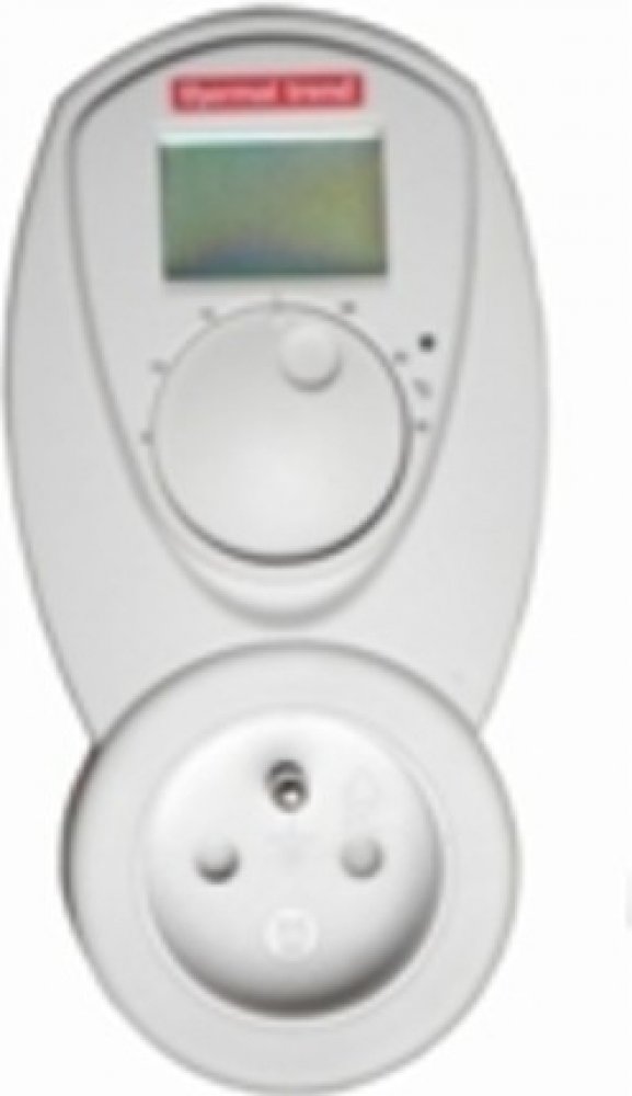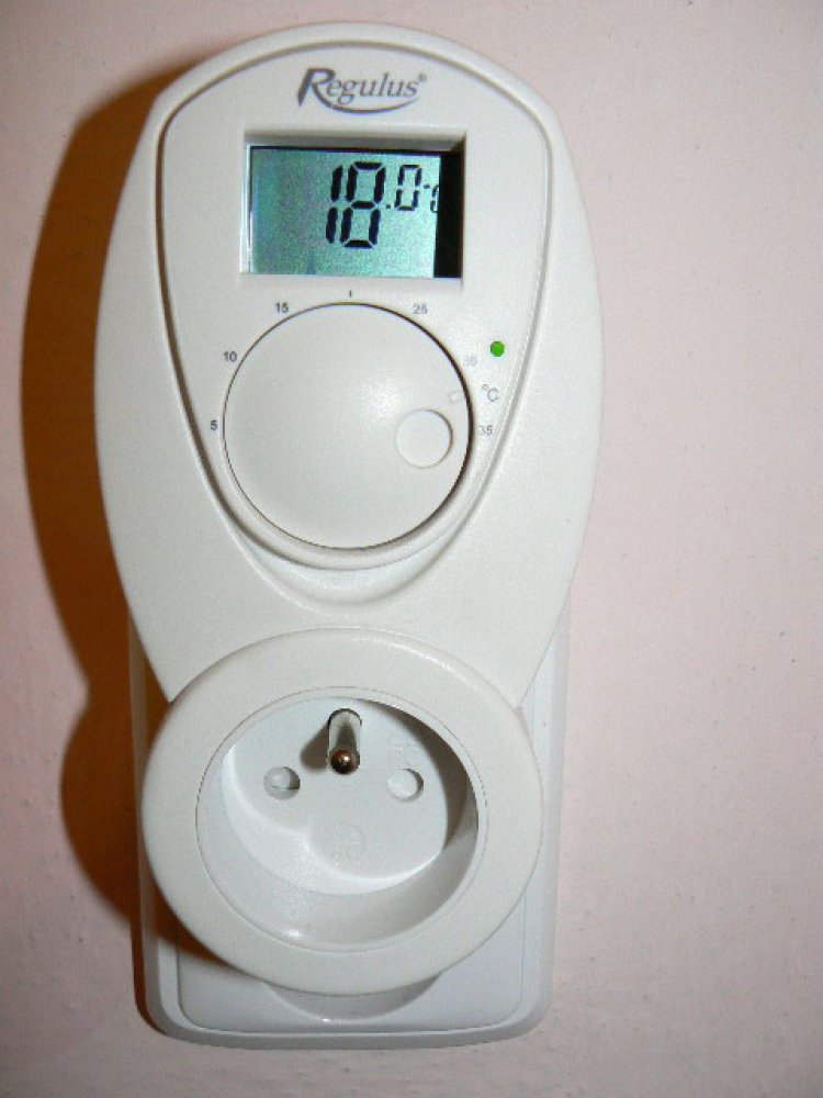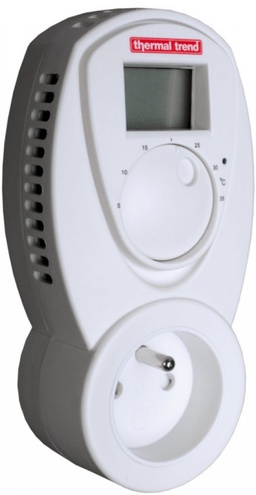 Zásuvkový elektronický termostat s LCD displejem, který zobrazuje teplotu v místnosti a aktuální stav termostatu (zapnut/vypnut). LED dioda pod displejem ukazuje aktuální stav elektrické zásuvky (sepnuta - rozepnuta). Je napájen síťovým napětím 230 V (k provozu není potřeba baterií).