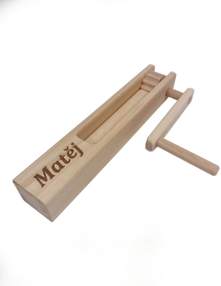 Dřevěná řehtačka z masivního lipového dřeva. Povrch je přírodní, vybroušený.