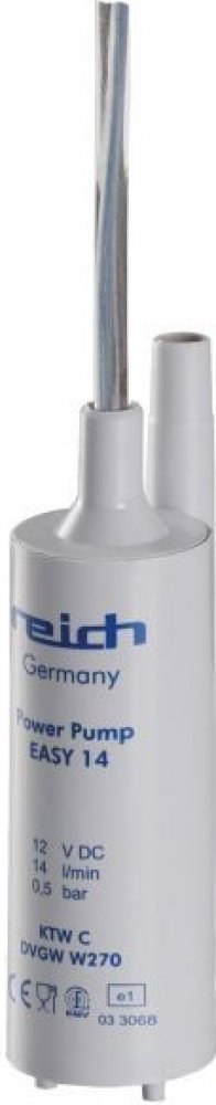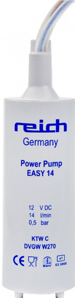 Ponorné čerpadlo Reich, které pracuje na 12 V a dosahuje průtoku 14 l/min při tlaku 0,5 bar. Toto čerpadlo lze připojit k 12V baterii nebo k transformátoru s usměrněným proudem. Ovládání je možné pomocí spínače ve vodovodním kohoutku, tlakového spínače nebo tlačítkového spínače. Čerpadlo je bezúdržbové a může krátkodobě běžet na sucho. Je vyrobeno z plastů, které jsou fyziologicky nezávadné. Výstupní je vhodný pro hadici o vnitřním průměru 10 nebo 12 mm.