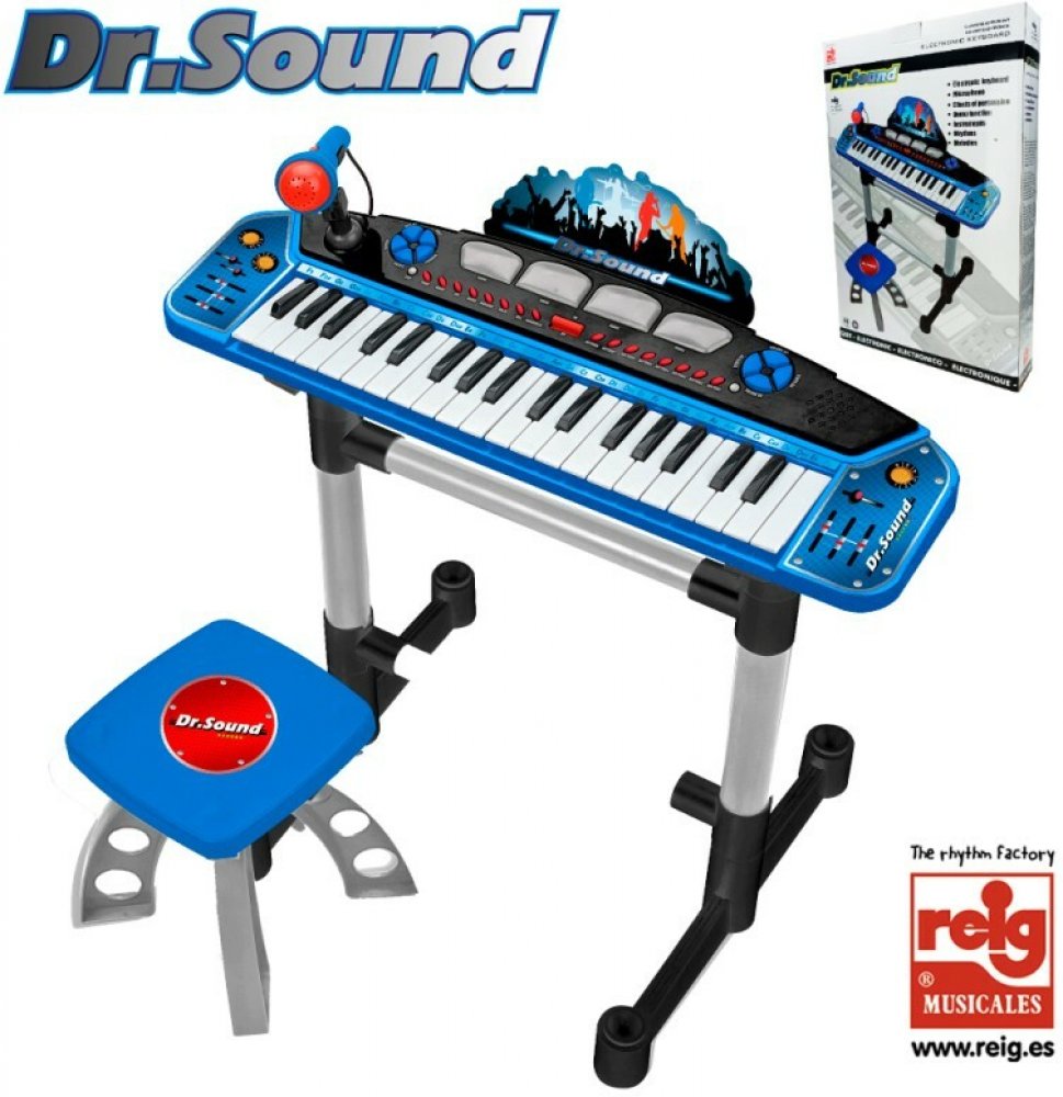Dětské polyfonické, elektronické klávesy s mikrofonem , 37 kláves, VYROBENO VE ŠPANĚLSKU z materiálů špičkové kvality, zaručujících VELMI KVALITNÍ ZVUK! 4 zvukové efekty, 4 bicí nástroje, 8 hudebních nástrojů, 8 rytmů, nahrané melodie, funkce nahrávání a přehrávání, reproduktor, nastavení hlasitosti a tempa. Nohy nástroje i stoličky lze odejmout a celou soupravu složit. Bateriový pohon na 3 alkalické baterie 1,5V typu LR6 (nejsou součástí balení). Dětské elektronické klávesy (dětské elektronické varhany, piano, pianko) DR. SOUND s mikrofonem a se židličkou patří mezi oblíbené hračky hudební nástroje na baterie a dětské hudební nástroje a jsou vhodné pro všechny chytré a hudebně nadané děti od stáří 4 roky do 10 let !