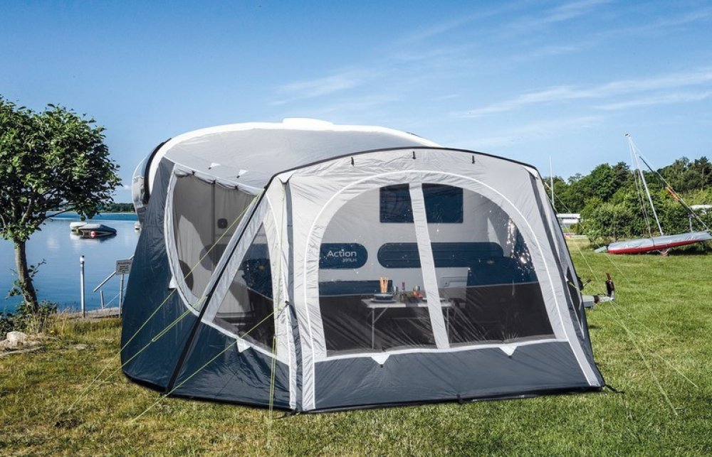 Nastavte rychle a snadno nafouknutím vzduchové hadice. Stan dokonale zapadá do křivky vnější stěny Adria Action. Boční okna s moskytiérami a rolovacími kryty, přední dveře lze srolovat nebo použít jako markýzu. Vybaveno odnímatelnou podlahou a krytem proti průvanu, aby se zabránilo průvanu.
