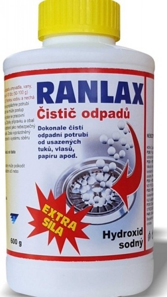 Hydroxid sodný na čištění odpadů tzv. KRTEK- RANLAX Použití: Do výlevky nebo sifonu odpadu umyvadla, vany, WC kanálku v podlaze se nasype 5 - 10 lžic ( 50 - 100g ) RANLAX čistič odpadů, zaleje 0,5 l horké vody a nechá asi 20 - 30 min působit. Potom se propláchne potrubí teplou vodou. Podle síly znečištění se může postup několikrát opakovat. Po ukončení práce se pracovní nářadí dokonale opláchne vo...