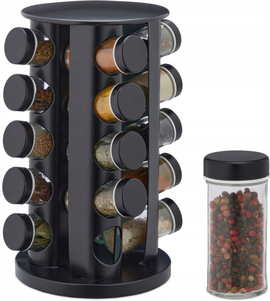 S tímto stylovým stojanem na pepř z černého nerezavějícího kovu můžete mít ve své kuchyni pořádek. 20 nádob na pepř se šroubovacím uzávěrem uchovává vaši sbírku koření od A až Z. Kořenky jsou rozmístěny na 5 úrovních, aby se ušetřilo místo a díky rozptylovým vložkám lze použít přímo jako pepřenku. Otáčení kořenky a otevřený design zajišťují, že nádoby na kořenky jsou při vaření au jídelního stolu na dosah a přehledně uspořádány.