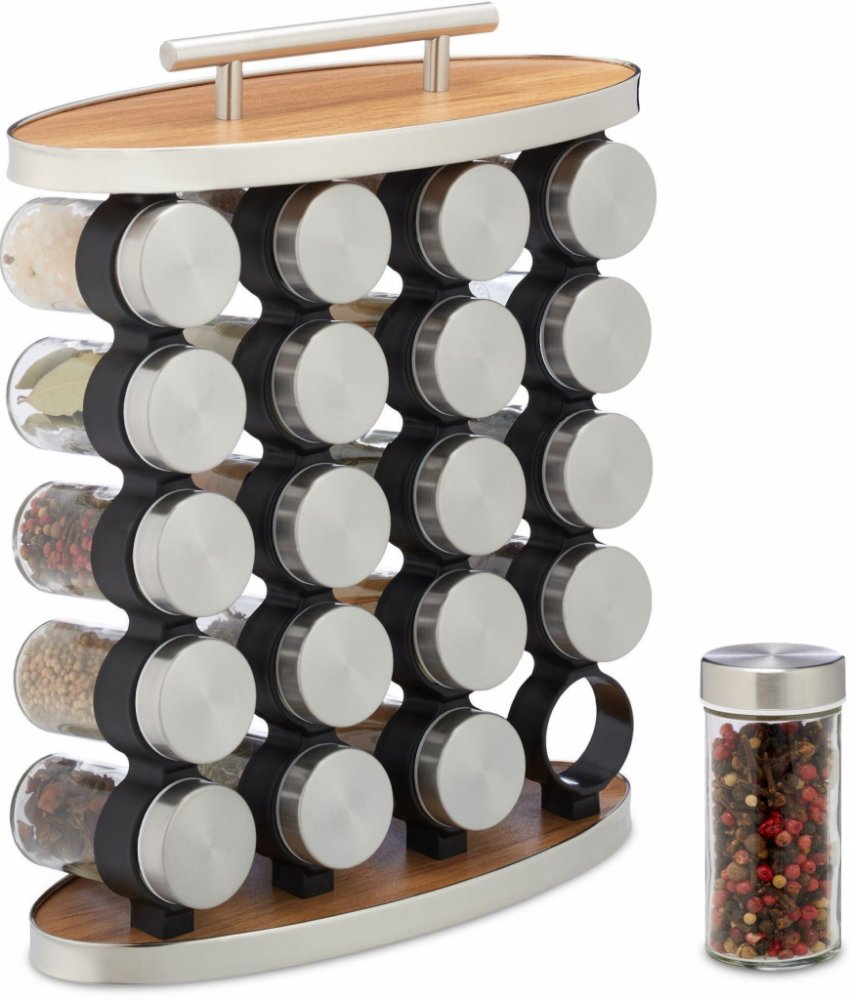 Udržujte pořádek v kuchyni s tímto volně stojícím organizérem na koření. do 20 nádobek na koření uložíte svou sbírku koření od A pro anýz až po Z pro skořici. Dózy na koření jsou uspořádány v 5 úrovních, aby se ušetřilo místo, a díky vložkám do šejkru je lze použít přímo jako kořenku. Díky otevřenému designu a praktickému držadlu na přenášení je koření po ruce při vaření i u jídelního stolu. Dekorativní design s atraktivním dřevěným vzhledem je poutavým prvkem. Stojan na kořenky v detailu - Celkové rozměry V x Š x H: cca 35 x 28 x 12 cm - Rozměry rukojeti v x š: cca 3 x 15 cm - Rozměry skla V x H: cca 9,5 x 4,5 cm - Objem jedné sklenice: cca 100 ml - Celková hmotnost: cca 2,8 kg - Materiál: nerezová ocel, sklo, MDF - Barva: stříbrná, přírodní, transparentní Dekorativní stojan na kořenky s 20 skleničkami na koření - Ideální pro skladování koření a bylinek - Lze použít přímo jako šejkr - S vložkou na šejkr - Se šroubovacími víčky pro chuťově neutrální skladování - V kuchyni upoutá pozornost díky modernímu designu a dřevěnému vzhledu - Snadné přenášení na jídelní stůl díky rukojeti - Snadné mytí nádob v myčce nádobí Rozsah dodávky - 1x stojan na koření - 20x dóza na koření (nenaplněná) - Dekorativní předměty nejsou součástí dodávky Počet kusů v balení:1 kusů