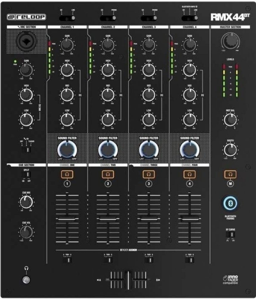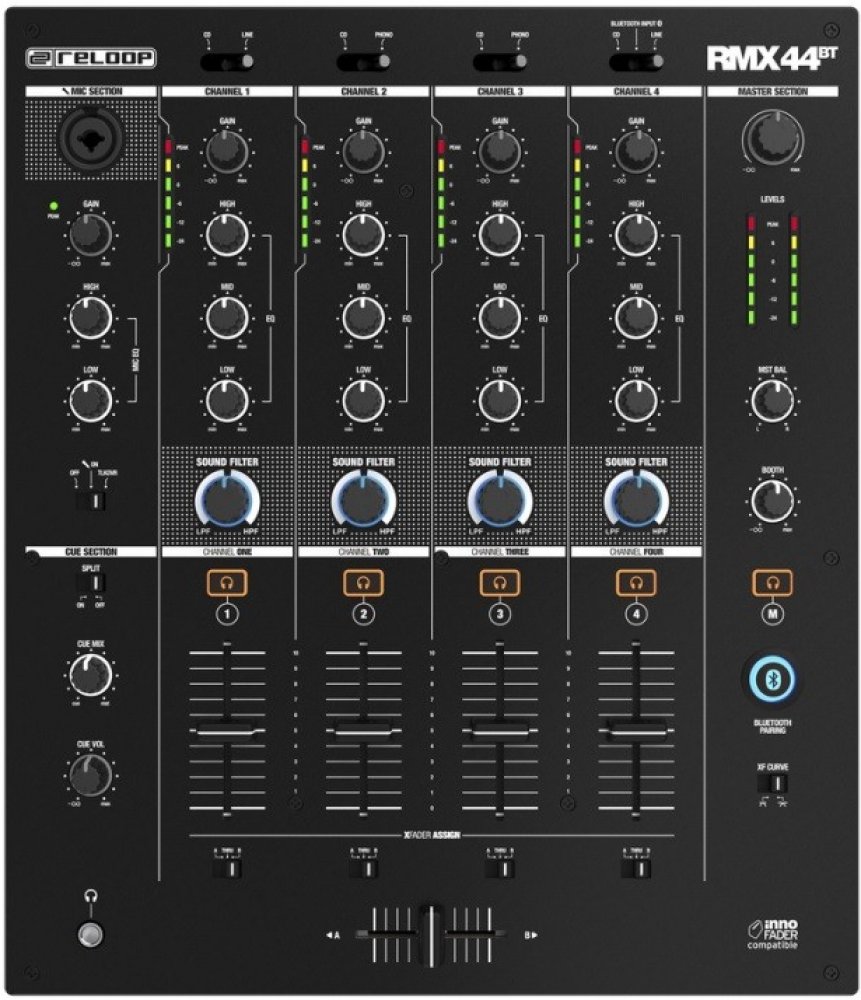 Reloop RMX-44 BT je kompaktní čtyřkanálový klubový mixpult s digitální architekturou, bezdrátovou technologií Bluetooth a integrovanými Instant Sound Colour efekty. Splňuje stejné zvukové standardy, které najdete ve vlajkové lodi firmy Reloop, mixu RMX-80.