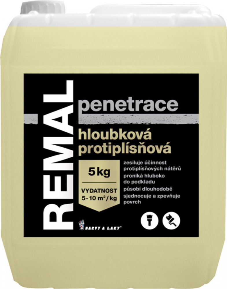 Používejte biocidní přípravky bezpečným způsobem. Před použitím si vždy přečtěte označení a informace o přípravku. Penetrace proti plísni a její vlastnosti: protiplísňová penetrace na zdivo, sádrokarton, beton a dřevo penetrace proti plísni preventivně omezuje tvorbu plísní zesiluje účinnost protiplísňových nátěrů, působí dlouhodobě hloubková penetrace zpevní podklad sjednotí nasákavost a zvýší přilnavost povrchu fungicidní a biocidní přípravek, používejte bezpečně efektivně probarvená dobře přetíratelná hloubkově zpevňuje podklad omezuje tvorbu trhlin na stěnách penetrace proti plísni balení 5 kg vystačí na 25 až 50 metrů čtverečních Technické vlastnosti penetrace proti plísni: vydatnost 5 - 10 m²/1 kg pro jeden nátěr podklad omítky, stěrky, betony, samonivelační hmoty a jiné podklady prostředí interiér, exteriér aplikace penetrace štětkou nebo válečkem žlutě zbarvená kapalina Ředění protiplísňové penetrace: na vysoce savé podklady se penetraci proti plísni používá neředěná na savé podklady se penetrace ředí až 1:0,5 (1díl penetrace : 0,5 dílu vody) na nenasákavé a málo savé podklady ředěná až 1:1 (1díl penetrace : 1 díl vody) vydatnost v závislosti na savosti podkladu a ředění je 5 až 10 m²/kg Příklad nátěrového postupu penetrace proti plísni: Podklad musí být suchý, zbavený prachu a nečistot. Místa napadená plísněmi ošetřete sanačním prostředkem REMAL Sanal na zdivo podle návodu. Před použitím je potřeba výrobek řádně promíchat. Nanášejte štětkou nebo válečkem v jedné nebo ve dvou vrstvách, podle savosti podkladu. Vrchní nátěr barvou aplikujte po zaschnutí penetrační vrstvy za 2 až 4 hodiny. Optimální teplota pro natírání je 15 až 25° C. Manipulace s penetrací proti plísni: Při práci dodržujte základní hygienická pravidla. Výrobek není určen k nátěrům přicházejícím do přímého styku s poživatinami, krmivy, pitnou vodou ani pro nátěry dětských hraček a dětského nábytku. Výrobek je ošetřený biocidem. Obsahuje 3-jód-2-propinyl-N-butylkarbamát, hexahydro-1,3,5-triazin-1,3,5-triethanol. Může vyvolat alergickou reakci. Uchovávejte mimo dosah dětí. Necítíte-li se dobře, vyhledejte lékařskou pomoc. Skladovatelnost protiplísňové penetrace: Výrobek si uchovává užitné vlastnosti 5 let od data výroby, v původním neotevřeném obalu. Skladujte v suchém skladu při teplotě 5 až 25 °C. Likvidace obalů a odpadů protiplísňové penetrace: Obaly se zbytky výrobku odkládejte na místo určené obcí ke shromažďování ostatních odpadů. Dále viz. oddíl 13 bezpečnostního list výrobku.Bezpečnostní upozornění produktu (H-věty)EUH208: Obsahuje (viz nebezpečné látky). Může vyvolat alergickou reakci.