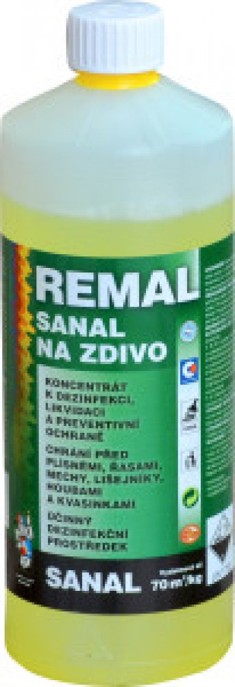Vlastnosti REMAL Sanal nátěr proti plísni a houbám:- protiplísňová penetrace- účinně vyřeší plíseň na zdi- koncentrát k dezinfekci, likvidaci a preventivní ochraně- chrání před plísněmi, řasami, mechy, lišejníky, houbami a kvasinkami- účinný dezinfekční prostředek- čirá kapalina zbarvená indikačním barvivemVydatnost REMAL Sanal na plíseň na zdi:až 70 m2 /1kg zředěného roztoku pro jeden nátěr.