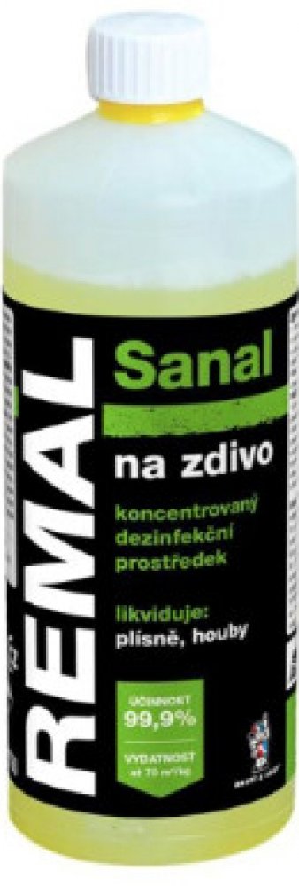 Remal Sanal na zdivo k sanaci a preventivní ochraně zdiva, omítek, kamene, betonu a jiných stavebních materiálů při napadení plísněmi a houbami. Vodný roztok kvarterní amoniové soli s přísadou značkovacího barviva a speciálního aditiva. Výrobek neobsahuje organická rozpouštědla ani těžké kovy.