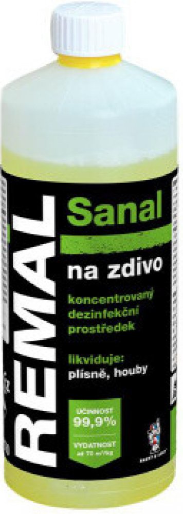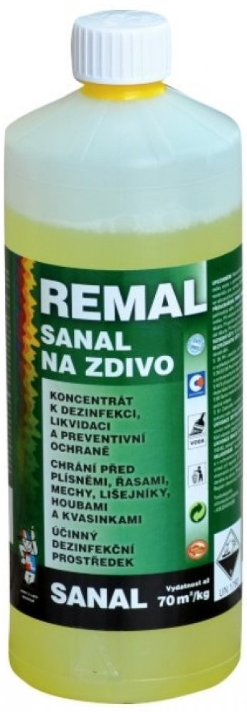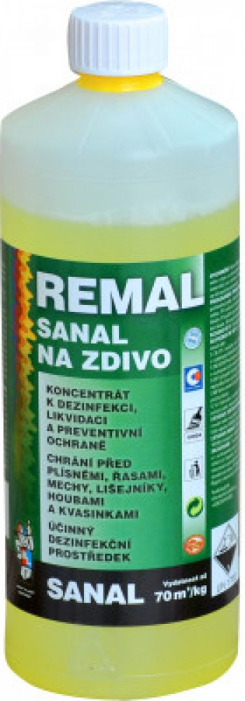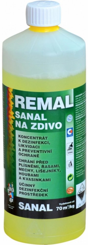 Remal Sanal na zdivo k sanaci a preventivní ochraně zdiva, omítek, kamene, betonu a jiných stavebních materiálů při napadení plísněmi a houbami. Vodný roztok kvarterní amoniové soli s přísadou značkovacího barviva a speciálního aditiva. Výrobek neobsahuje organická rozpouštědla ani těžké kovy. Vlastnosti REMAL Sanal nátěr proti plísni a houbám: účinně vyřeší plíseň na zdi koncentrát k dezinfekci a likvidaci chrání před plísněmi a houbami účinný dezinfekční prostředek čirá kapalina zbarvená indikačním barvivem Vydatnost REMAL Sanal na plíseň na zdi: až 70 m² /1kg zředěného roztoku pro jeden nátěr. Technické vlastnosti přípravku na plíseň na zdi nátěr proti plísni aplikace štětec nebo štětka ředidlo voda podklad zdivo, omítky, kámen, beton a jiné stavební materiály prostředí interiér a exteriér ředění nátěru proti plísni 1:9, na cihlové zdivo 1:5 Pracovní postup protiplísňového nátěru: Plochy napadené plísněmi je třeba zajistit proti vlhnutí zatékáním a izolací proti vzlínání vody. Před použitím nátěru proti plísni na zdi REMAL Sanal jej nařeďte vodou v poměru 1 : 9, pro ošetření cihlového zdiva proti plísni se REMAL Sanal ředí vodou v poměru 1 : 5. Plochy napadené plísněmi se natřou zředěným roztokem a plísně se zamokra mechanicky odstraní např. špachtlí. Po zaschnutí se nátěr zředěným roztokem 1-2 krát opakuje. Po vyschnutí ošetřeného povrchu proti plísni v interiéru je vhodné provést nátěr malířským přípravkem barvou proti plísni s preventivní protiplísňovou přísadou (např. REMAL protiplísňová barva). Po zaschnutí se technologické vlastnosti ošetřeného povrchu po aplikaci malířských přípravků a fasádních nátěrových hmot nemění. Obsah účinných složek protiplísňové penetrace: N-alkyl (C12-16) (benzyl) dimethylamoniumchlorid (ES 270-325-2) : min. 190 g/kg výrobku. Upozornění nátěru proti plísni: Používejte biocidní přípravky bezpečným způsobem. Před použitím si vždy přečtěte označení a informace o přípravku. Manipulace: Může ohrozit zdraví při požití, nadýchání, styku s pokožkou a sliznicemi. Dráždí pokožku, oči a dýchací cesty. Chraňte před dětmi a nepoučenými osobami. Používejte ve větraných prostorách. Nesmí být použito jinak, než je uvedeno v návodu. Nesmí být použito na nátěry přicházející do přímého styku s potravinami, krmivy a pitnou vodou, k nátěrům materiálů pro výrobu dětských hraček a nábytku.Bezpečnostní upozornění produktu (H-věty)H314: Způsobuje těžké poleptání kůže a poškození očí.Pokyny pro bezpečné zacházení (P-věty)P102: Uchovávejte mimo dosah dětí.P260: Nevdechujte prach/dým/plyn/mlhu/páry/aerosoly.P280: Používejte ochranné rukavice/ochranný oděv/ochranné brýle/obličejový štít.P301+P330+P331: PŘI POŽITÍ: Vypláchněte ústa. NEVYVOLÁVEJTE zvracení.P303+P361+P353: PŘI STYKU S KŮŽÍ (nebo s vlasy): Veškeré kontaminované části oděvu okamžitě svlékněte. Opláchněte kůži vodou/osprchujte.P310: Okamžitě volejte TOXIKOLOGICKÉ INFORMAČNÍ STŘEDISKO/lékaře/ tel. 224