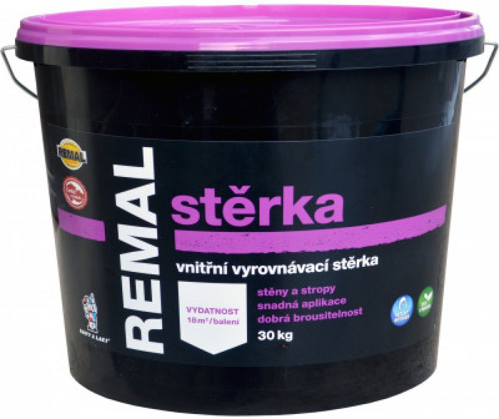 REMAL Stěrka je vyrovnávací a dekorační stěrka pro vnitřní použití s výbornou brousitelností. Používá se k celoplošnému vyrovnávání drobných nerovností stěn (omítek, zdiva, sádrokartonů apod.) v interiérech. Velmi snadno se nanáší, je zdravotně nezávadný a ekologický.