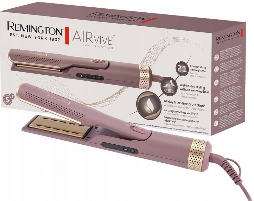 - Typ 2 v 1 pro mokré a suché vlasy – se dvěma režimy stylingu: šetrně schne a vyhlazuje mokré vlasy, upravuje a vyhlazuje suché vlasy. V režimu WetMode zajišťuje koncentrovaný proud vzduchu v kombinaci s nízko temperovanými stylingovými deskami efektivní sušení bez škodlivého tepla. Zachovává přirozenou vlhkost až 24 hodin (V laboratorních testech REMINGTON prokázáno po 24 hodinách v režimu WetMod).