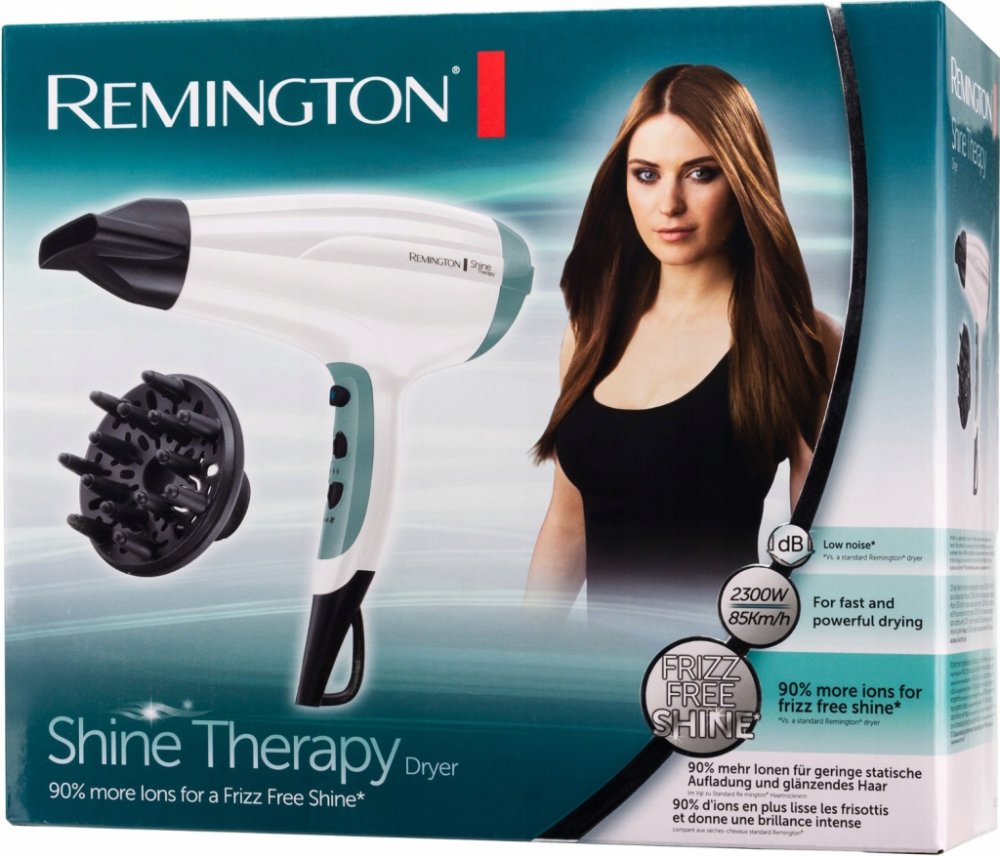 Vysoušeč na vlasy Shine Therapy od Remingtonu Vám přináší překrásně lesklé vlasy bez krepatění při každém vysoušení díky inovativní ionické technologii od Remingtonu. Vysoušeč využívá iontový generátor, který vydává o 90% více iontů* pro úžasné, dlouhotrvající výsledky bez krepatění. Během stylingu cestuje horký vzduch přes mřížku, která vypouští více iontů než běžné vysoušeče vlasů.