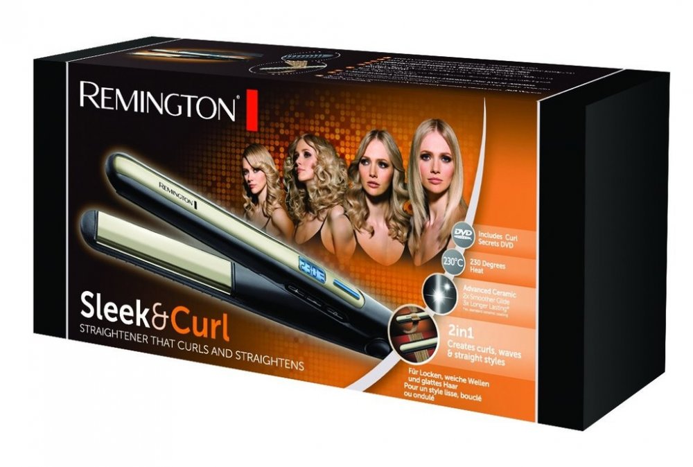 Žehlička na vlasy Remington Sleek & Curl S6500 narovnává a natáčí díky specifickým zaobleným hranám a drážkám vedoucím prameny vlasů pro vytvoření různých typů vzhledů, obsahuje odkaz na video ‘Curl Secrets’.