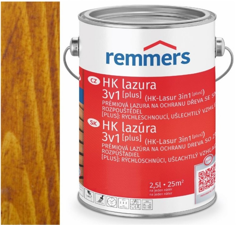 HK lazura 3v1 [plus] 2,5L 5444 Dub rustikální - Eiche rustikal kombinuje impregnaci, základní nátěr a lazuru v jednom produktu. Díky rychlému schnutí, které trvá pouze několik hodin, je možné aplikovat více vrstev během jednoho dne. Tím je ochrana dřeva maximálně jednoduchá a zároveň vysoce účinná. Tato nová generace HK lazury má snížený obsah rozpouštědel a nabízí vynikající zpracovatelnost. I p...
