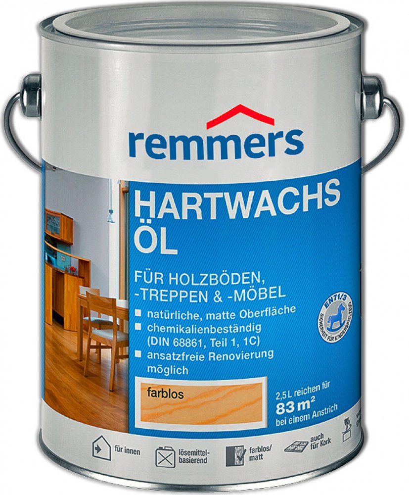 Remmers tvrdý voskový olej slouží k dekoraci a ochraně interiérových dřevěných povrchů, jako je nábytek, obklady, podlahy, parkety, schodiště apod. Je vhodný i na korek