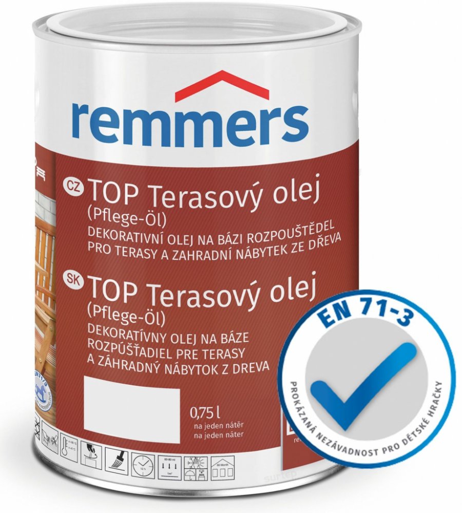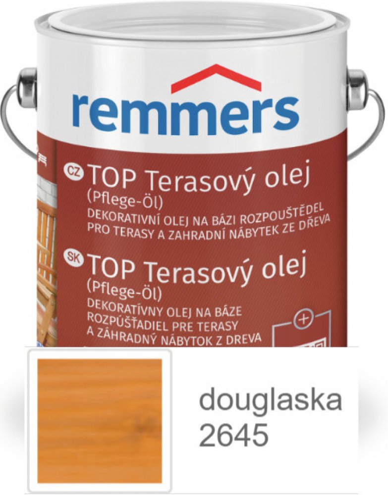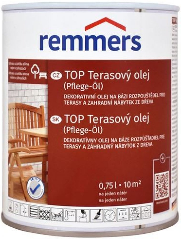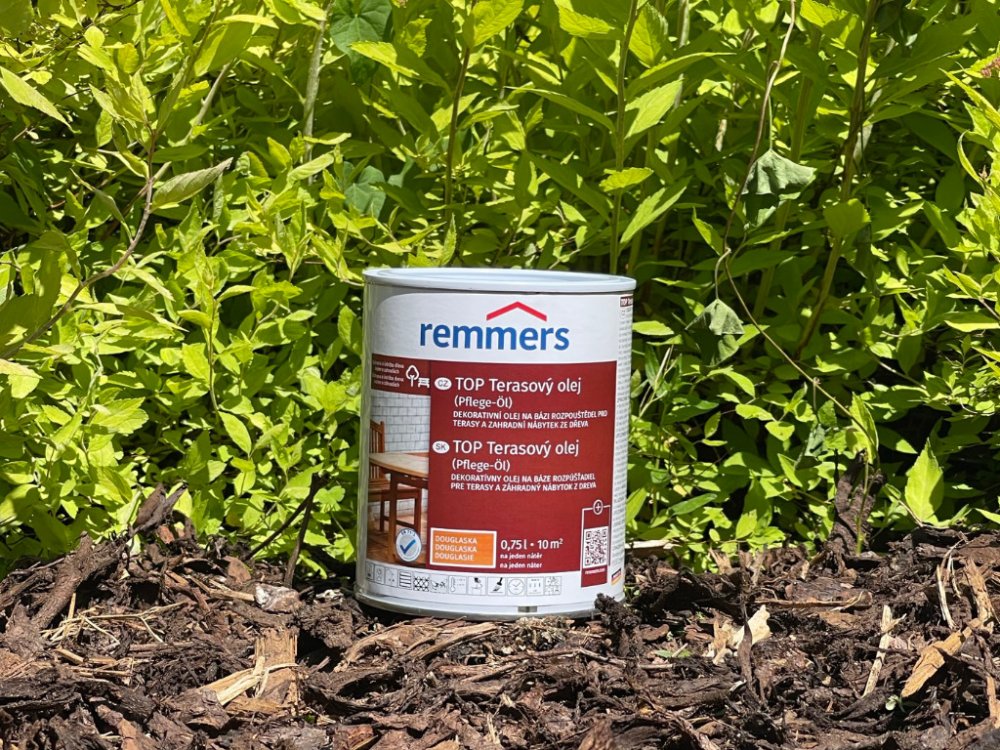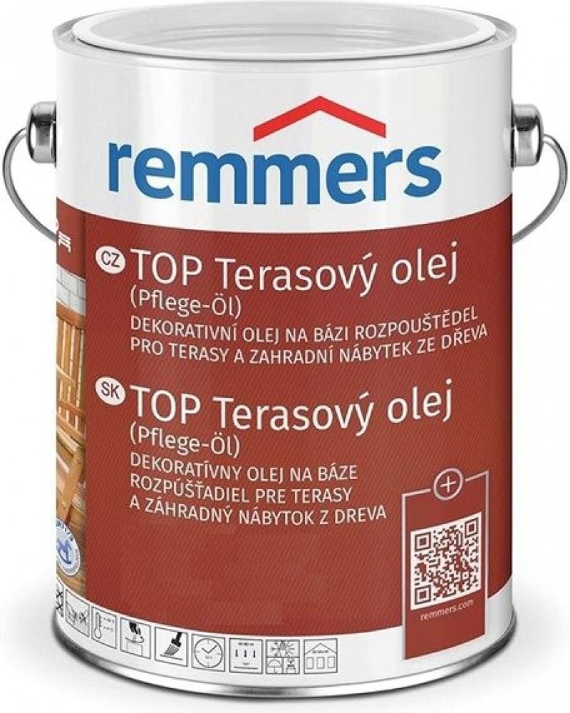 Remmers - Top Terarový olej na bázi rozpouštědel je určen pro ochranu a údržbu dřevěných teras a zahradního nábytku. Tento olej je vhodný jak pro použití v interiéru, tak v exteriéru a poskytuje dřevu dlouhodobou ochranu proti povětrnostním vlivům. Vyniká jednoduchou aplikací a brilantními barevnými odstíny, které zlepšují vzhled dřeva.