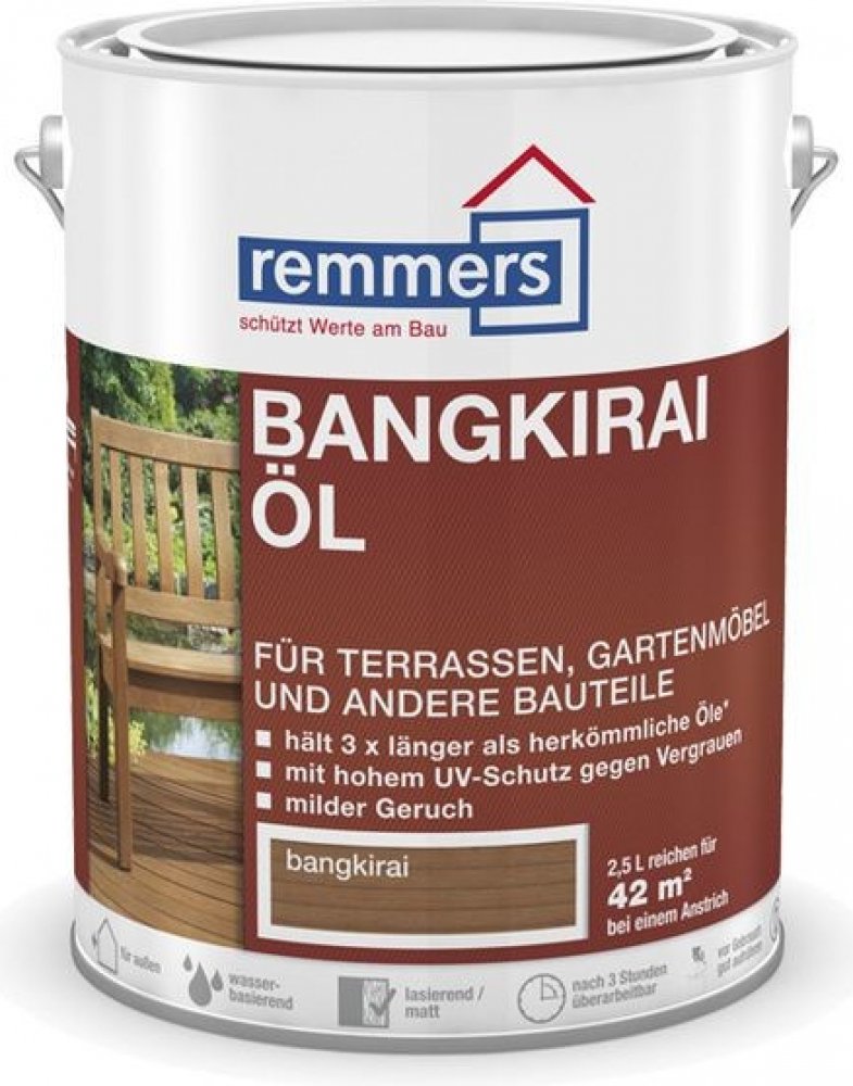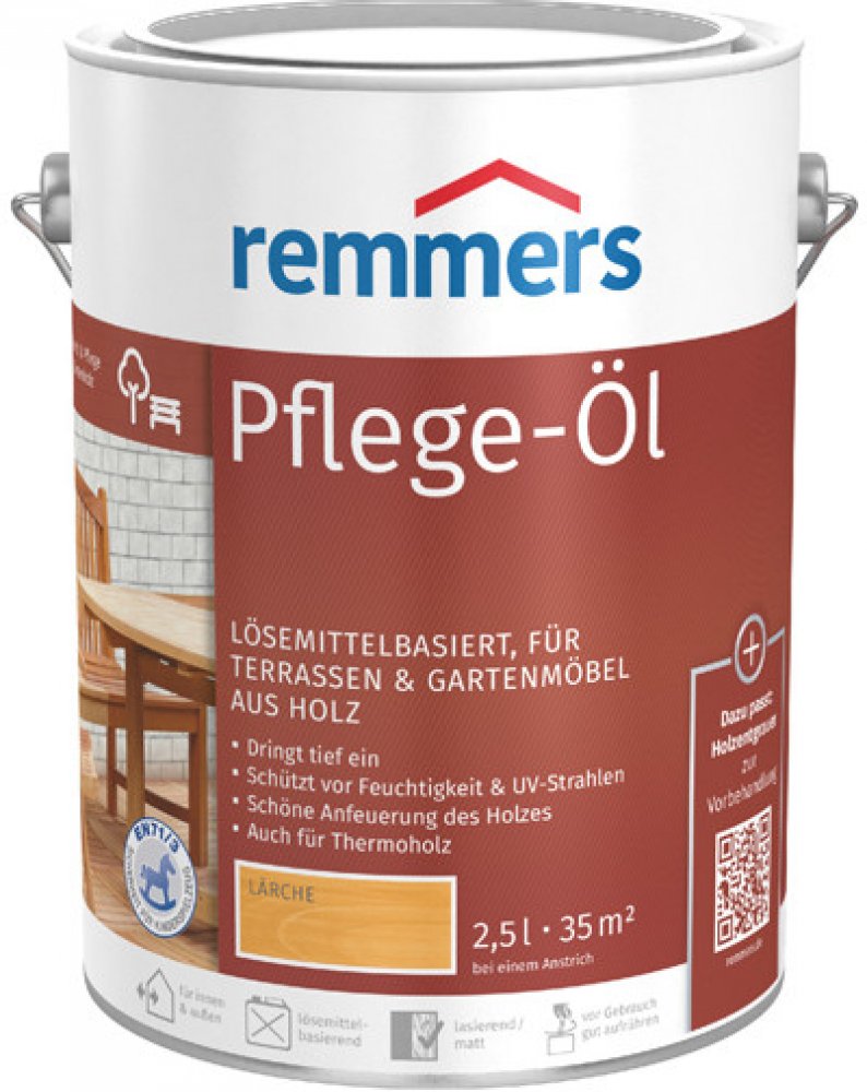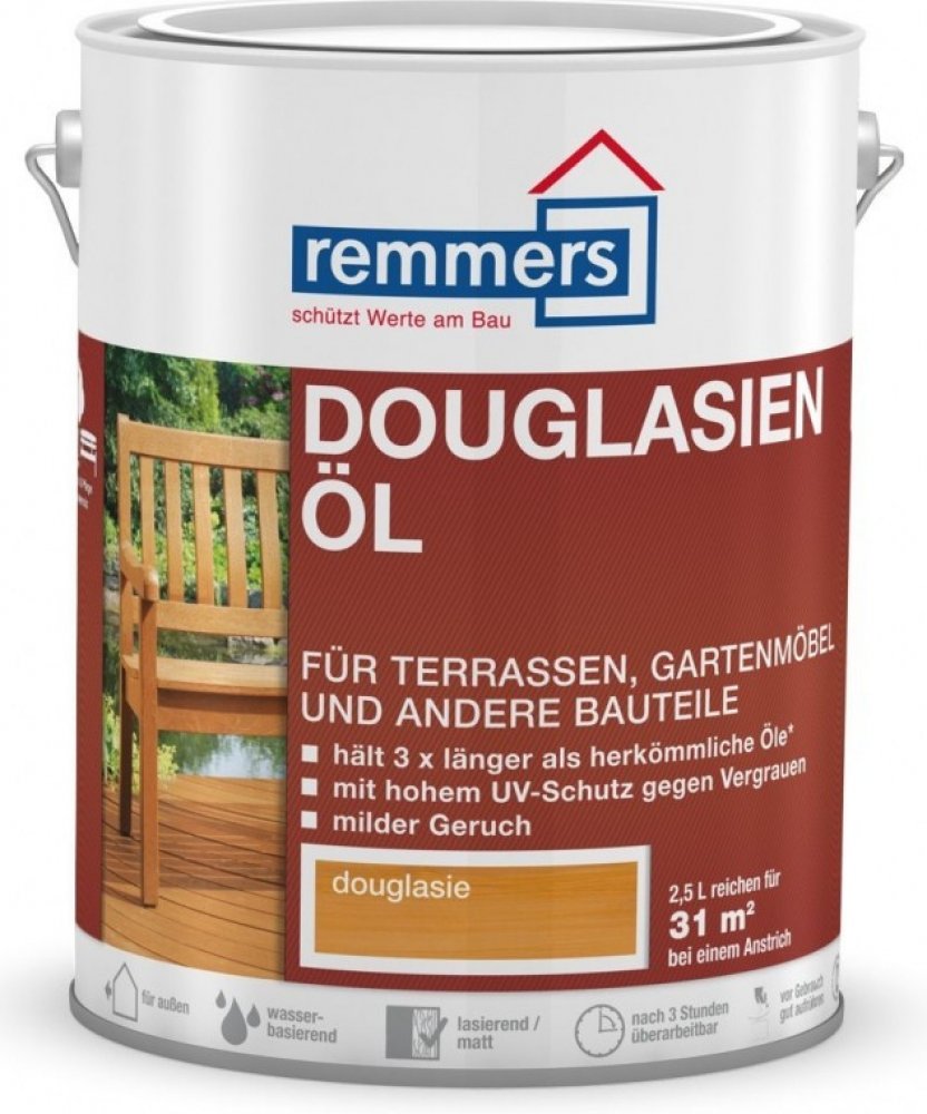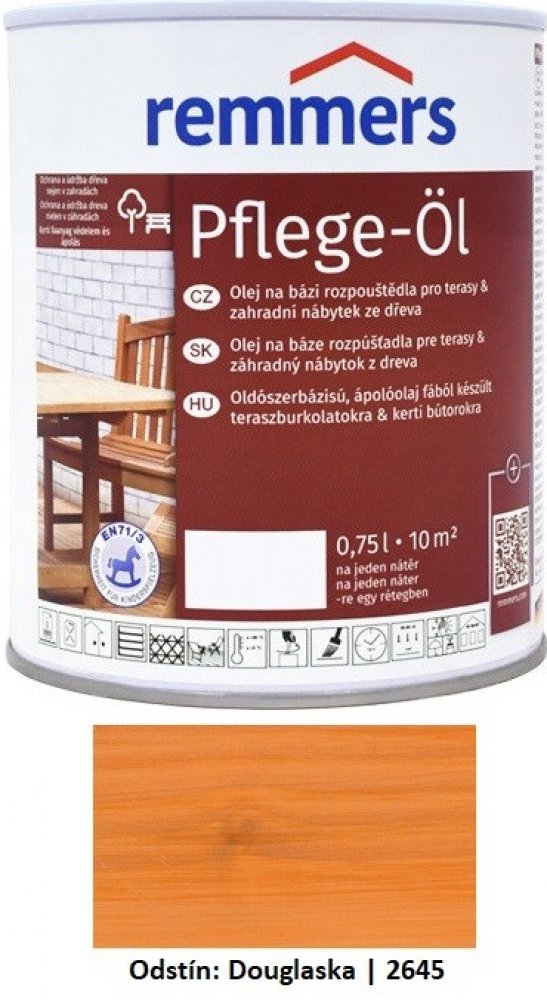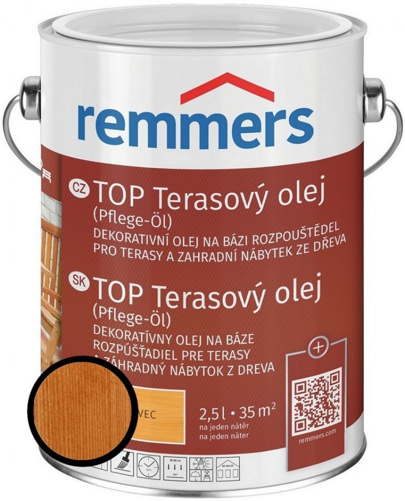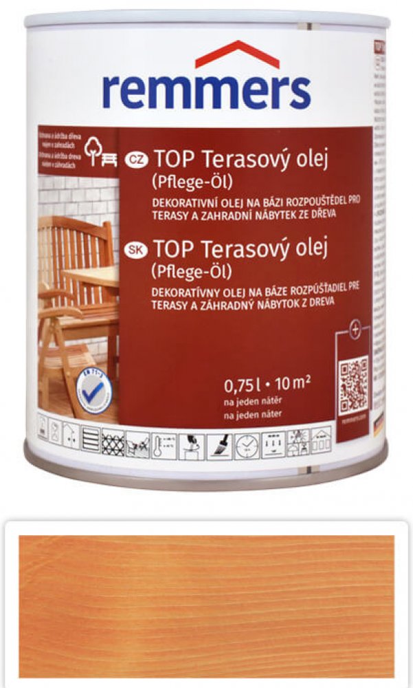 Remmers - Top Terarový olej na bázi rozpouštědel je určen pro ochranu a údržbu dřevěných teras a zahradního nábytku. Tento olej je vhodný jak pro použití v interiéru, tak v exteriéru a poskytuje dřevu dlouhodobou ochranu proti povětrnostním vlivům. Vyniká jednoduchou aplikací a brilantními barevnými odstíny, které zlepšují vzhled dřeva.