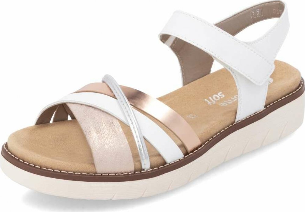 Obuv REMONTE – jedná se o vyšší řadu značky RIEKER, tato obuv se vyznačuje vynikající kombinací svrchních materiálů. Svršek těchto sandálů je vyroben v unikátním designu překřížení pásků v přední části a decentních odlesků, které dodají elegantní vzhled. Zapínání je u tohoto modelu řešeno kotníkovým řemínkem s gumičkou, který se utahuje pomocí suchého zipu. Jedinečná vyjímatelná stélka zajistí cel...