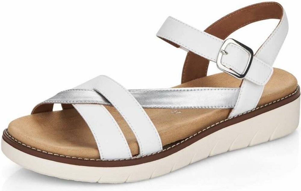Obuv REMONTE je vyšší řadou značky RIEKER, obuv se vyznačuje kvalitou použitých materiálů. Svršek sandálů Vás zaujme svým překřížením pásků v oblasti nártu. Zapínání je u tohoto modelu řešeno páskem s gumičkou, který se utahuje pomocí suchého zipu a je ozdoben imitací přezky. Jedinečná vyjímatelná stélka zajistí celodenní komfort a bílá podešev svým lemováním tenkým hnědým proužkem dolaďuje celkový vzhled obuvi k dokonalosti. Tento model sandálů se stane vaším oblíbeným modelem pro každý slunečný den.