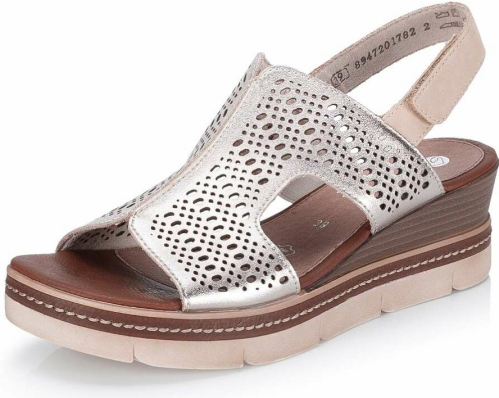 Obuv REMONTE – jedná se o vyšší řadu značky RIEKER, tato obuv se vyznačuje vynikající kombinací svrchních materiálů. Tyto skvostné sandály RIEKER představují spojení elegance a pohodlí pro letní období. Kožený materiál svršku s metalickými odlesky dekoruje krásný perforovaný vzor a pro vytvoření dokonalého designu jsou boční části vykrojeny. Zadní pásek je opatřen suchým zipem a vsazenou gumičkou, což usnadňuje obouvání a zároveň zajistí pevné držení na noze. Kožená stélka a vyšší podešev dodává sandálům vynikající pohodlí pro celodenní nošení. Ženský půvab a maximální pohodlí se dokonale spojují v těchto sandálech, které jsou ideální pro každodenní nošení i pro večerní posezení s přáteli.