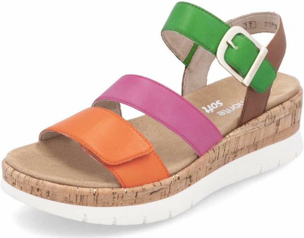Obuv REMONTE – jedná se o vyšší řadu značky RIEKER, tato obuv se vyznačuje vynikající kombinací svrchních materiálů. Stylové sandály ideální pro letní dny, které zaujmou kombinací výrazných barev tří kožených pásků vytvářejících svršek a designová spona u kotníku zvýrazňuje jejich celkový šarm. Dva pásky se suchým zipem umožňují snadné přizpůsobení obuvi tvaru nohy, čímž zaručují maximální pohodlí každým krokem. Vyšší podešev opticky prodlouží tvar nohy a zároveň poskytuje stabilitu, zatímco tvarovaná stélka širšího střihu přispívá k celodennímu komfortu a navíc je vyjímatelná. Perfektní doplněk pro každý letní outfit budou tyto sandály.