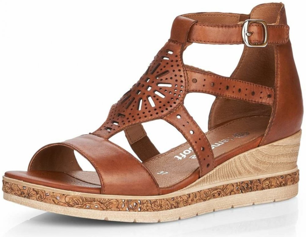 Obuv REMONTE je vyšší řadou značky RIEKER, obuv se vyznačuje kvalitou použitých materiálů. Sandály zaujmou svou perforací na nártu a ozdobným páskem v podešvi. Svršek tvoří pásky spojené středovým perforovaným dílem. V kotníkové části se zapínají řemínkem s imitací přezky na suchý zip, který má z vnitřní strany gumičku pro lepší obouvání. Tyto hnědé sandály mají plnou patu a kožená stélka změkčuje...