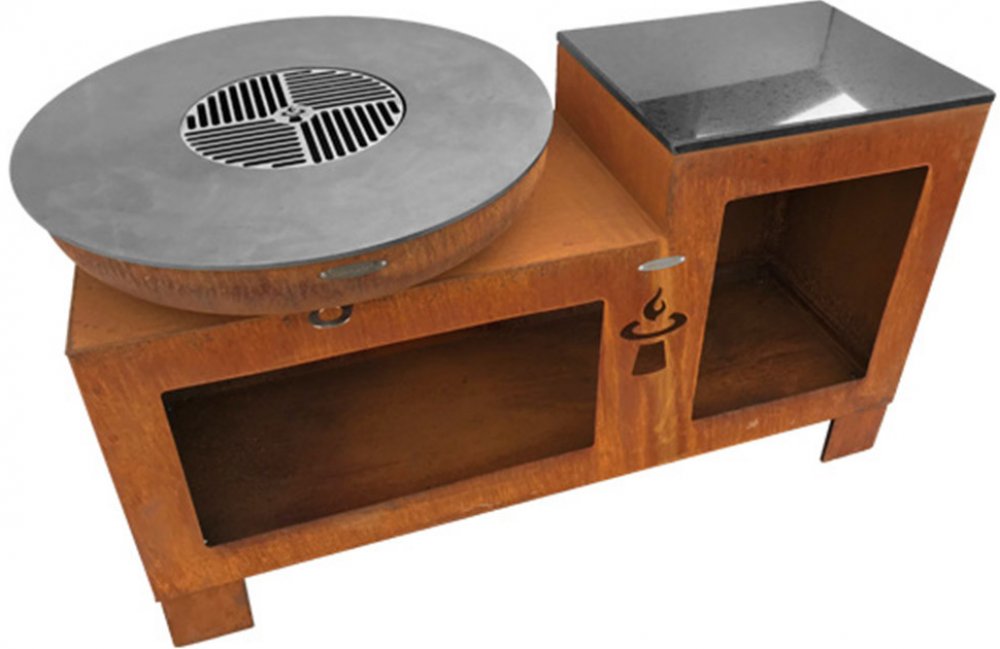 Robustní venkovní ohniště Remundi s kulatou grilovací plotnou, praktickou pracovní plochou a zásobníkem na dřevo pro celoroční grilování nebo jen příjemné posezení u plápolajícího ohněRustikální design zrezlého kovu dokonale zapadne do Vaší zahradyVysoká hmotnost (123 kg) zajišťuje výbornou stabilitu a tepelnou akumulaciJako palivo se používá kusové dřevo nebo dřevěné uhlíKe grilování slouží ocelová grilovací plotna vyrobená z 8 mm silné oceli o průměru 82 c