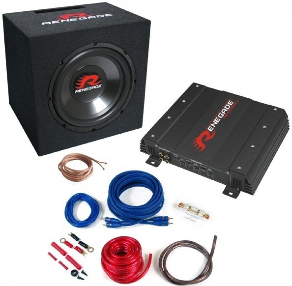 Set obsahující subwooferový box Renegade RXV1000 osazený 25 cm subwooferem, 2-kanálový zesilovač Renegade REN550S a kabelovou instalační sadu Renegade REN10KIT
