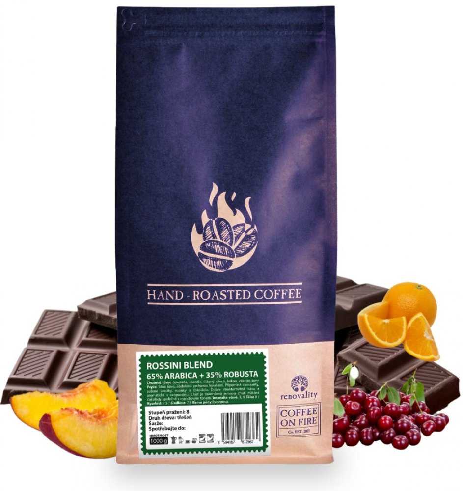 ROSSINI BLEND, 65% ARABICA + 35% ROBUSTASilná káva, obdařená prchavou kyselostí. Připomíná croissanty, sušené švestky, rozinky a čokoládu. Dobře strukturovaná káva a aromatická v cappuccinu. Chuť je zakončená jemnou chutí mléčné čokolády společně s mandlovým tónem.Obal je opatřen zipovým uzávěrem a jednocestným ventilem, který zabraňuje kyslíku, aby se dostal do obalu.Káva tak může být zabalena krátce po upražení a neztrácí tak na své jedinečné chuti.Proč kávu ROSSINI BLEND, 65% ARABICA + 35% ROBUSTA?Vyvážená síla a jemnost: Kombinace 65 % Arabiky a 35 % Robusty vytváří harmonickou chuť – Arabika přináší jemnost a aromatičnost, Robusta dodává plnost, sílu a výraznější charakter.Plné tělo a bohatá crema: Díky podílu Robusty má káva hutné tělo a vytváří krásně hustou a stabilní cremu, kterou oceníte především u espressa.Čokoládovo-oříškový profil: V chuti dominují tóny hořké čokolády, kakaa a pražených ořechů, které dodávají kávě příjemnou hloubku a dlouhý dozvuk.Nízká až jemná acidita: Káva je chuťově vyvážená bez výrazné kyselosti, což z ní dělá ideální volbu pro ty, kteří preferují plnější a méně kyselý šálek.Ideální na espresso i mléčné nápoje: Díky své intenzitě se skvěle hodí na espresso, cappuccino i latte – její chuť zůstává výrazná i v kombinaci s mlékem.Energie a charakter: Vyšší podíl Robusty přirozeně zvyšuje obsah kofeinu, takže káva dodá energii a zároveň nabídne plný chuťový zážitek.Intenzita vůně: 7,9Tělo: 8,0 Kyselost: 7,5 Sladkost: 7,9 Barva pěny: bronzováChuťové tóny: čokoláda, mandle, lískový ořech, kakao, dřevité tónyPodobné produktyVybrali jsme pro vás oblíbené alternativy.BRASIL SANTOS NY2 scr. 17/18 Fine Cup★★★★★5,0 • (13) „Velmi jemná a vyvážená chuť, ideální káva na každé ráno.“ OtevřítBRAZIL CERRADO DULCE, 100% ARABICA★★★★★4,9 • (58) „Příjemně nasládlá káva s čokoládovým tónem, velmi lahodná.“ OtevřítBRAZIL EXTRAFINO, 100% ARABICA★★★★☆4,7 • (19) „Vynikající chuť, jemná a příjemná. Jedna z mých nej káv.“ Otevřít