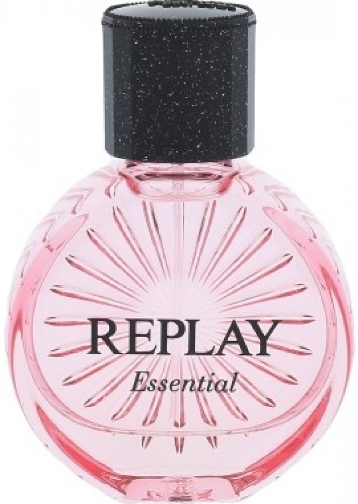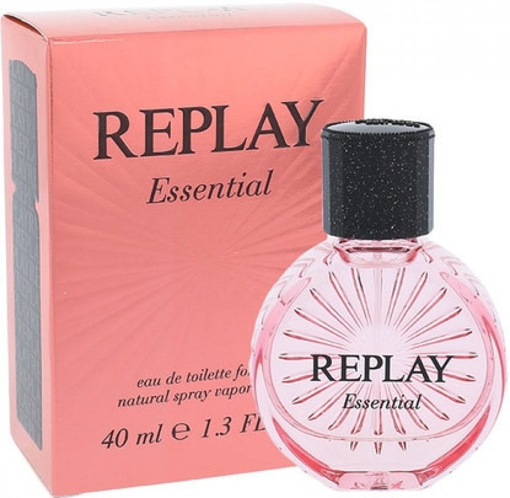 Replay 40 ml dámské toaletní vody květinové romantické a smyslné Essential For Her mainstreamové bergamot, cassis, pomeranč, zelené jablko frézie, hloh, lotus, slunečnice cedr, karamel, pižmo, santalové dřevo, vanilka jarní kompatibilní s bergamotem, s zeleným jablkem, s vanilkou Replay klasické TSA kompatibilní (≤100ml) rozprašovač standardní