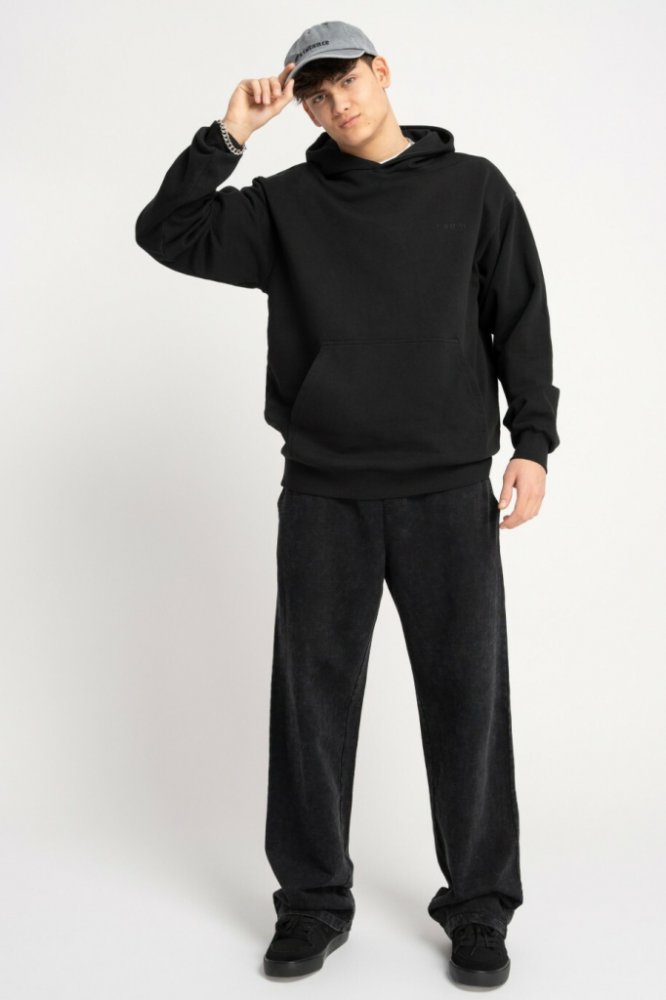 Černé široké tepláky s sepraným efektem jsou perfektní volbou pro ty, kteří si cení pohodlí a originálního stylu. Volný střih a široké nohavice jim dodávají ležérní pocit, zatímco elastický pas s prošíváním a nastavitelnými šňůrkami zajistí perfektní padnutí. Vypraný efekt získaný technikou ACID WASH jim dodává jedinečný vzhled. Vyrobeny z na dotek příjemné, vysoce kvalitní česané bavlny, spojují pohodlí s módním, jedinečným designem charakteristickým pro Reporter.