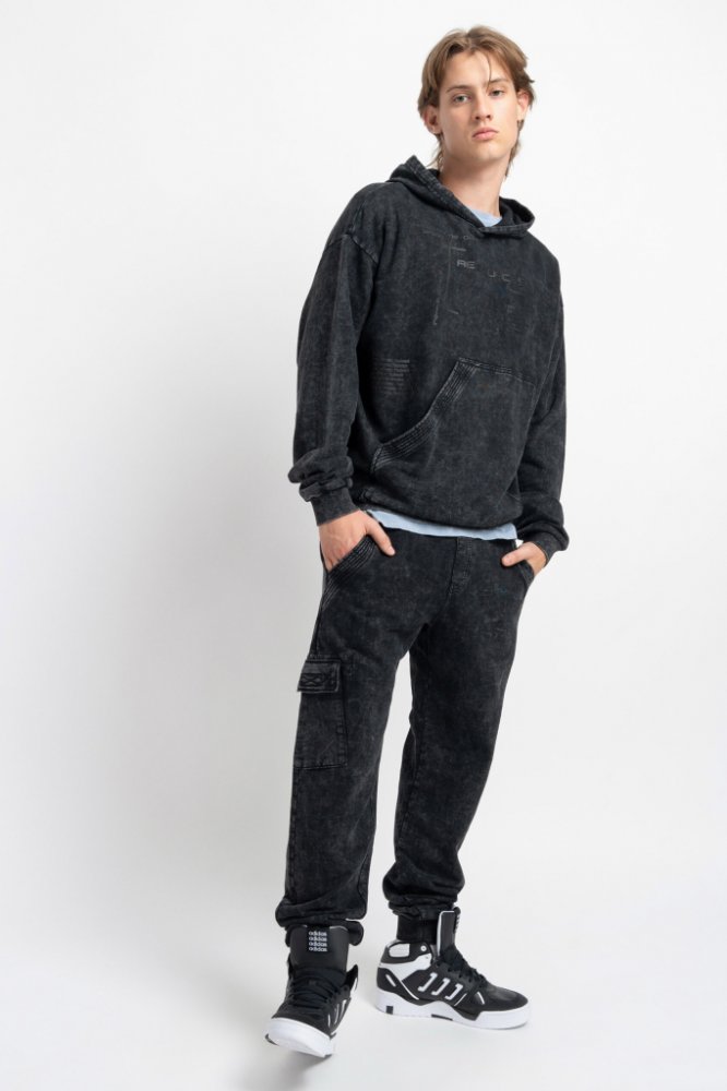 Černé tepláky se sepraným efektem a kapsou na nohavici, z kvalitní česané bavlny