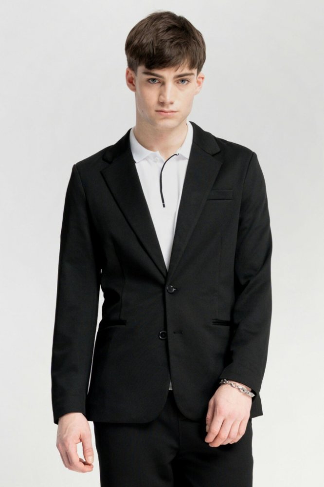 Černé sako je nadčasový doplněk šatníku, který se bude hodit v každém elegantním stylu. Má klasický vypasovaný střih a mírně zúžené rukávy s manžetami na knoflíky. Zapínání na knoflíky, s límečkem s vroubkovanými klopami, dokonale zvýrazní siluetu díky tvarujícím průstřihům vpředu i vzadu. Imitace kapes a knoflíková dírka dodávají eleganci, zatímco zadní rozparek umožňuje větší volnost pohybu. Vyrobeno z vysoce kvalitního materiálu s průhlednou vazbou. Komplet můžete sladit s kalhotami ze stejné látky. Ve společnosti Reporter se zaměřujeme na kvalitu a jedinečný styl.