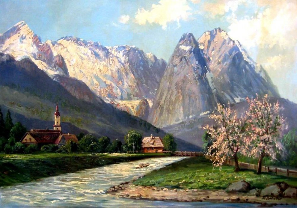 Reprodukce obrazu na plátně " Jaro pod horami ", jehož autorem je malíř Albert Blaetter.