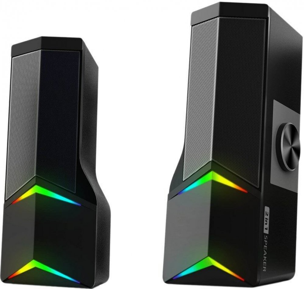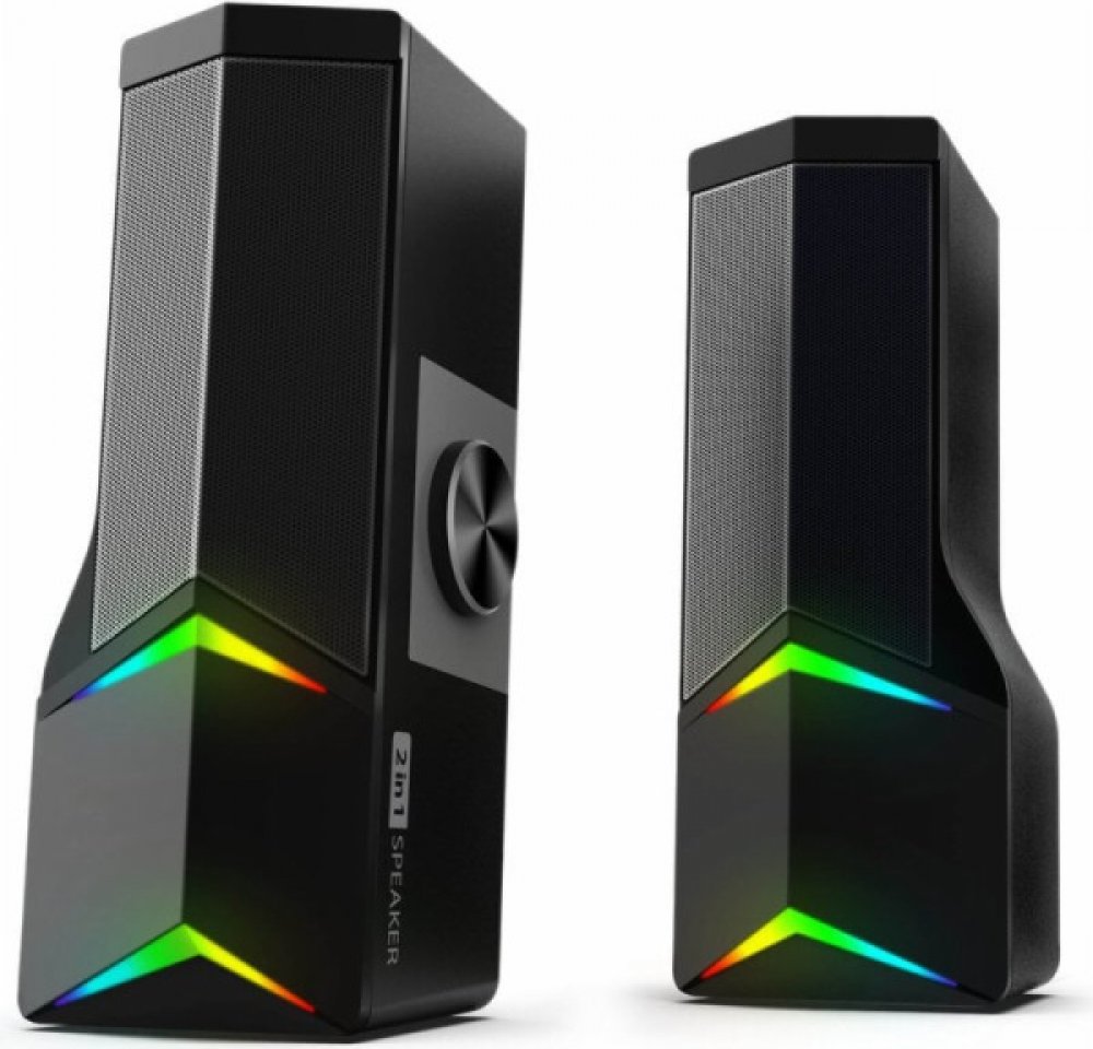 Reproduktory k PC 2 v 1. Možnost použít jako soundbar pod monitor nebo jako 2.0 sestavu. Výkon: 2 x 3 W Frekvenční rozsah: 150 Hz - 20 KHz Bluetooth verze 5.0 RGB osvětlení Audio vstup: 3,5 mm jack Napájení přes USB (5V/1A) Rozměr: 380 x 70 x 70 mm (jeden ks) Hmotnost: 700 g.