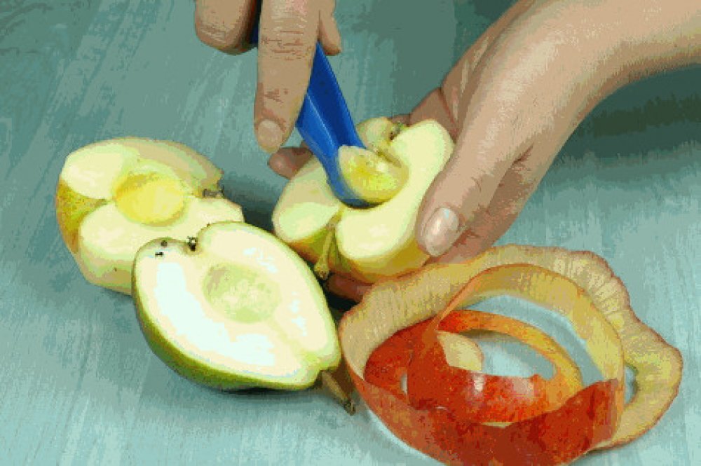 Škrabka je ale vybavena také vykrajovačem jadřinců a hrotem na dočištění zeleniny.