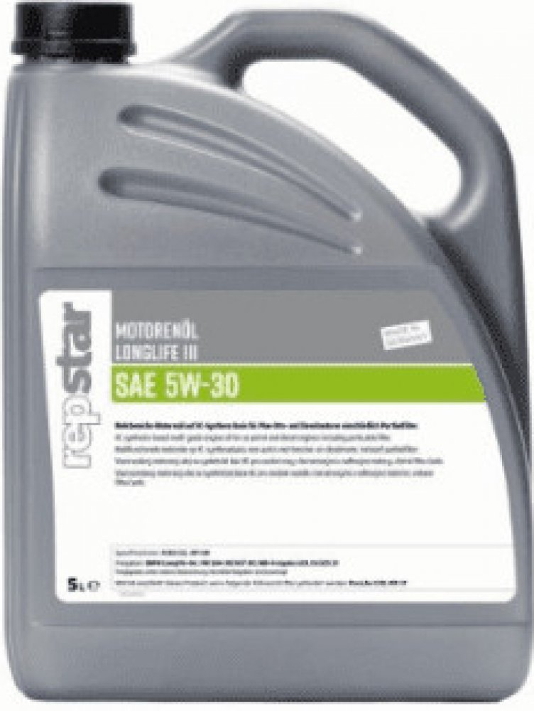 **Polosyntetický **motorový olej REPSTAR LL III. Balení 5 litrů. **Specifikace**: *22951, 2205000, ACEAC3, ACEAA3B404, APISNCF, APISNCFLL3, BMWLONGLIFE04, C30LL3, LONGLIFE04LL3, MB22931, MB22931LL3, MB22951, MB22951LL3, PORSCHEC30LL3, VW50400, VW50400LL3, VW50700, VW50700LL3*