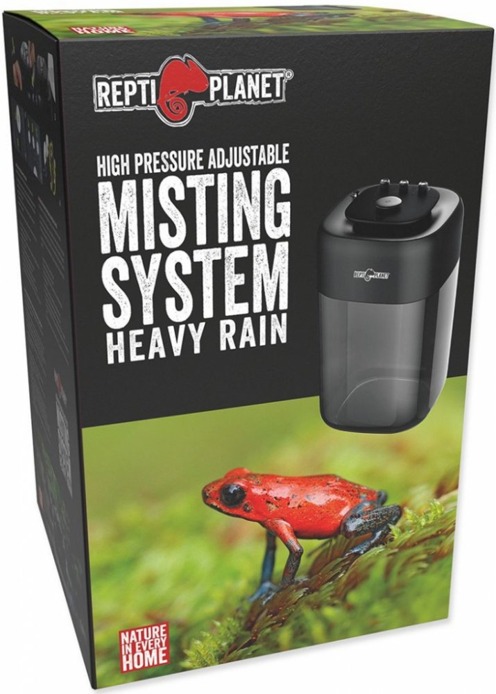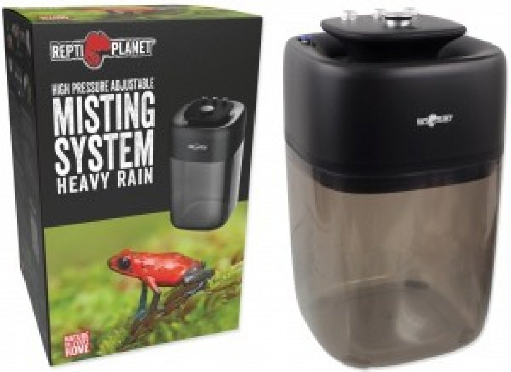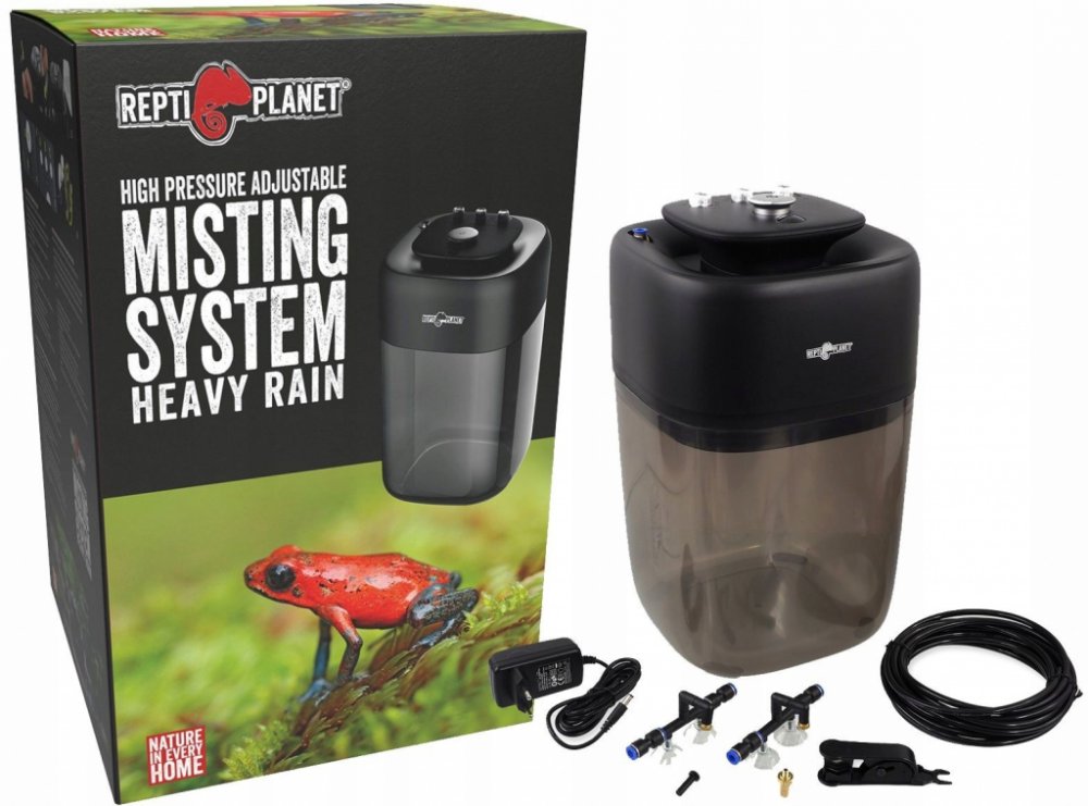Vysokotlaký nastavitelný rosící systém. Simuluje prostředí a vlhkost deštného pralesa při chovu plazů v teráriu.