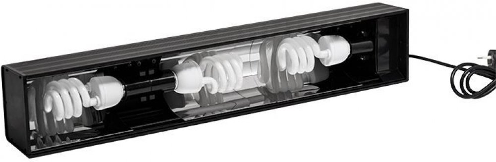 Kvalitně zpracované osvětlení pro terarijní žárovky. Konstrukce umožňuje horizontální použití žárovek, což je ideální varianta pro UVB žárovky, které touto instalací nabízejí vyšší výkon UVB záření. Pro výhřevné žárovky je tento systém nevhodný, neboť se v drtivé většině jedná o žárovky s reflektorovým systémem a žárovka by tedy ohřívala pouze vnitřní část světla...