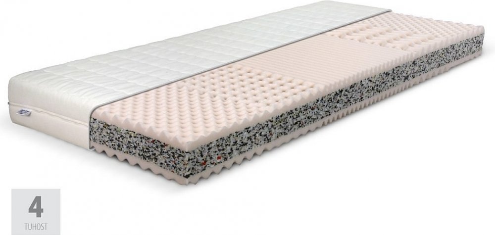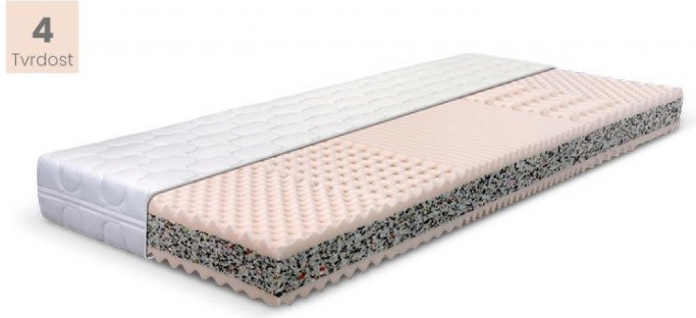 5-zónová matrace z kvalitních pěn zajišťuje anatomicky správný a velmi dobrý spánkový komfort. Oboustranné jádro matrace je složeno z desky kvalitního odlehčeného polyuretanu a po obou stranách tvořeny masážními deskami z vysoce kvalitní pěny tuhosti 25 kg / m a sup3;. Matrace je vybavena potahem Dry fast Argentum anebo AntiAging dle výběru zákazníka. Výška matrace v potahu je 16 cm a je určen pro váhovou kategorii do 90 kg. Matrace je vhodná na lamelový pevný i polohovatelný rošt.