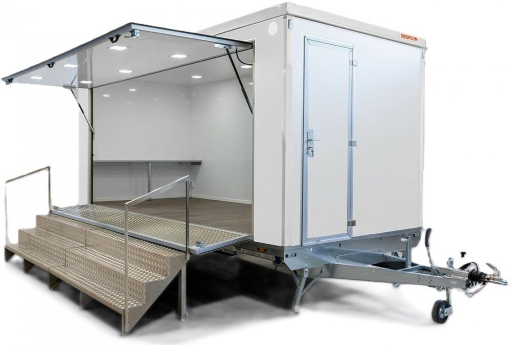 Univerzální PROMO přívěs RESPO 2000F512T220 SHOWROOM, mobilní kancelář je ideálním řešením pro prezentaci služeb nebo výrobků pro zákazníky. Přívěs RESPO T220 lze využít například pro festivaly, výstavy, veletrhy a podobné akce. Je vybaven boční výklopnou stěnou, která umožňuje mít přívěs zcela otevřen, nebo otevřen pouze z poloviny a využít ho jako prodejní stánek, například pro občerstvení zá...