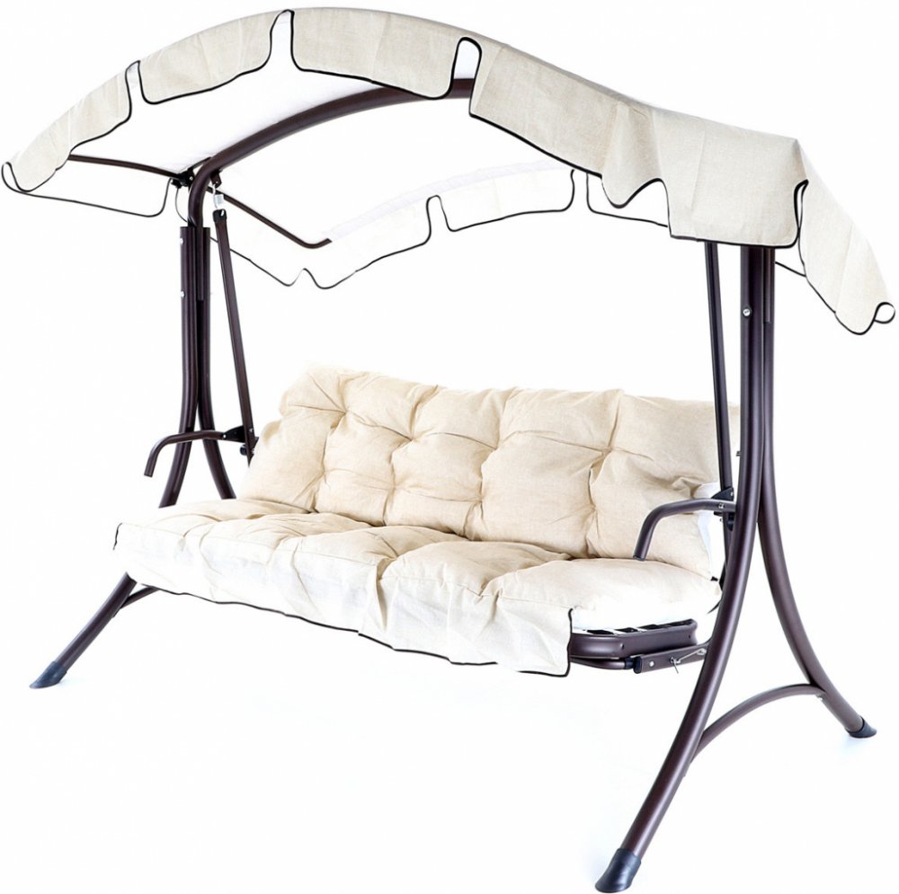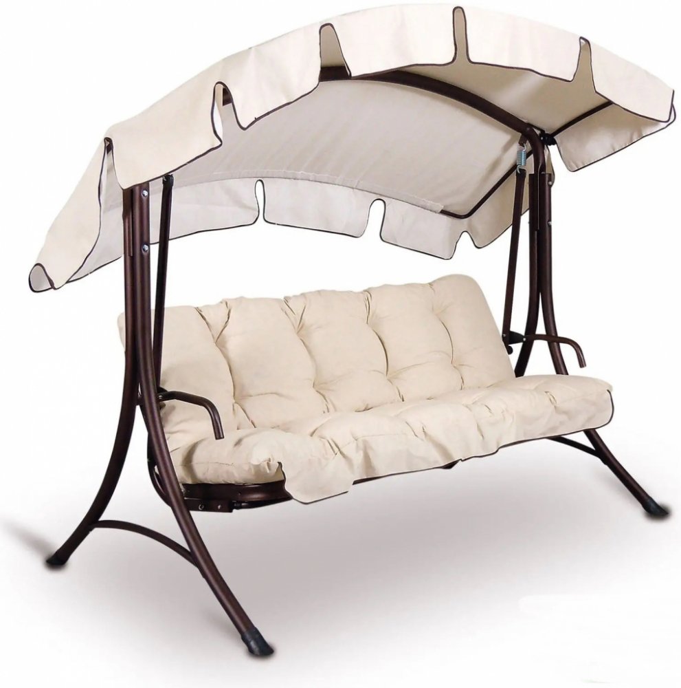 Zahradní třímístná houpací lavice s drátěným odpruženým sedákem.