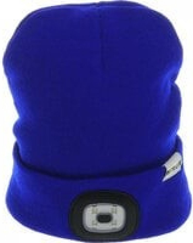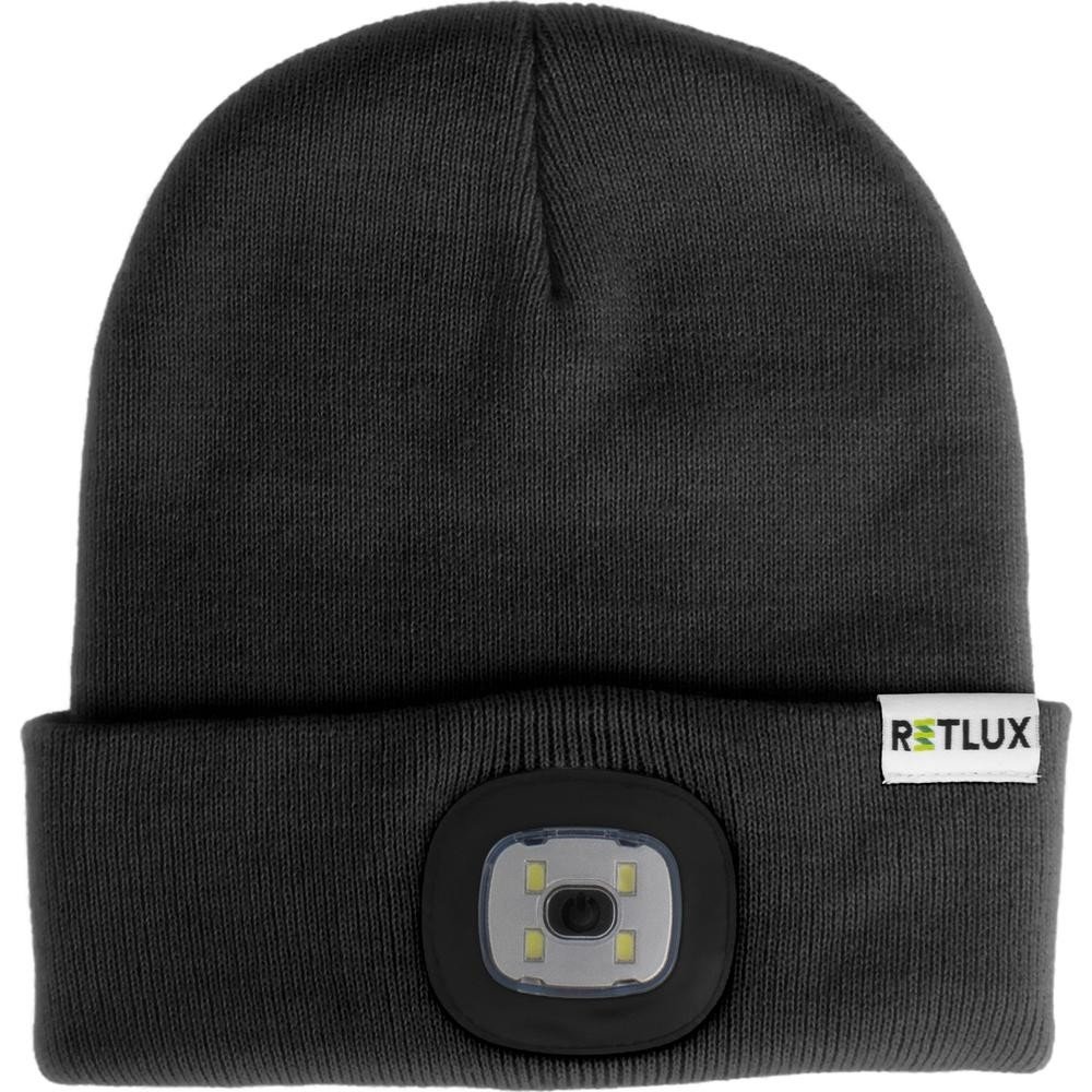 Svíticí nabíjecí čepice modré barvy s LED svítilnou RETLUX. Světlo lze jednoduše vyjmout a čepici vyprat. Zahřeje i posvítí. Stylová čepice RETLUX 2 v 1.